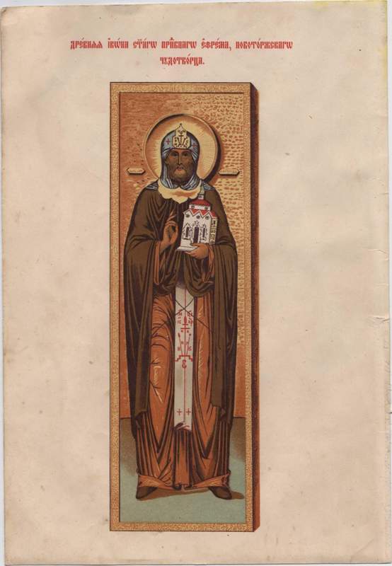 На свитке, который преподобный Ефрем держит в руке на иконе, обычно пишется текст: «Оставив свой болярский сан и дом, воздвиже храм во имя государей своих, святых Бориса и Глеба, и множество иноков собрав, обитель устрои, довольно в посте и молитвах потрудився». (18)