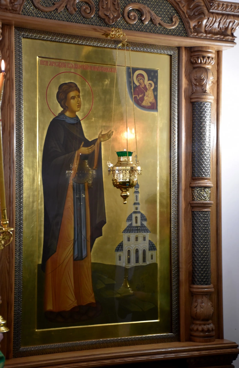 Кондак, глас 2: К глубинам Божественного разума вперив ум свой, в небесныя обители востекл еси и равноангельно житие, отче Аркадие, на земли пожил еси, и во всем повинулся еси духовному своему настоятелю и наставнику, преподобному отцу Ефрему, и ныне, вкупе предстояще у Престола Владыки Христа, молися непрестанно о всех нас.