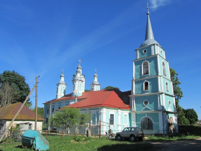 Каменный храм в честь Происхождения Честных Древ Животворящего Креста Господня (Всемилостивого Спаса, по архивному источнику 1804 г. – во имя Спаса Нерукотворного Образа) построили в селе Тесове Сычевского уезда (Новодугинского района) в 1758 году на средства тайного советника Петра Ивановича Салтыкова. В конце XVIII века к западу от храма поставили пятиярусную колокольню. В 1829 году храм и колокольню на средства помещицы Анны Ивановны Логгиновой соединили трапезной с приделами. Южный придел - во имя священномученика Григория епископа, просветителя Великой Армении; в северном – во имя праведных Симеона Богоприимца и Анны пророчицы, богослужение не проводится. В главном храме сохранился двухъярусный иконостас конца XVIII века.