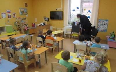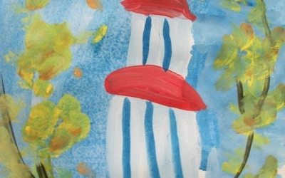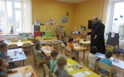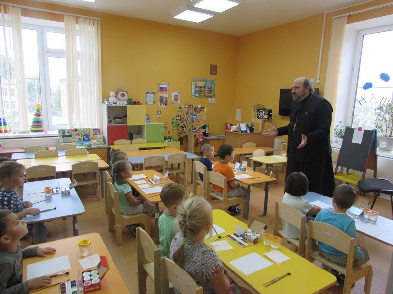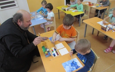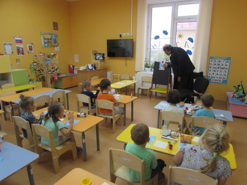 Недавно к ребятам на занятие по рисованию пришел настоятель храма Введения Пресвятой Богородицы протоиерей Олег Переверзев. Священник поговорил с детьми о красоте природы, о том как нужно беречь природу и заботиться о ней. Затем все вместе рисовали православный храм. Приступая к творческой работе, ребята подготовили необходимый материал, вспомнили, как выглядит храм. Под красивую, спокойную музыку юные художники приступили к работе. Сам храм - белого цвета, купол – желтый, золотой. Синее небо и золотая листва окружили белокаменные стены.