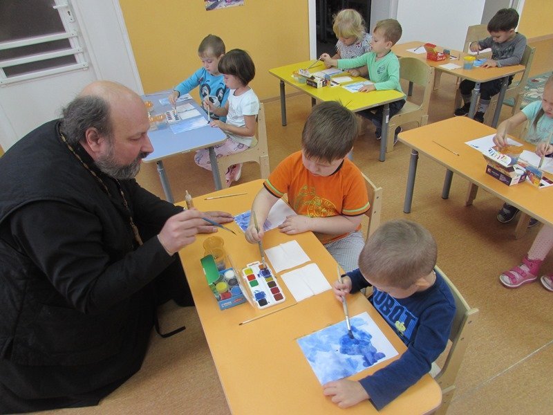Все ребята внимательно следили, как рисует отец Олег и с большим старанием изображали Божий храм на своих листках. Это занятие оставило неизгладимое впечатление в сердцах детей.