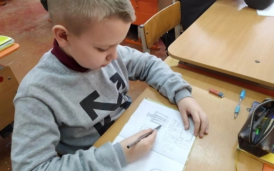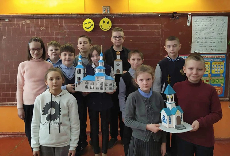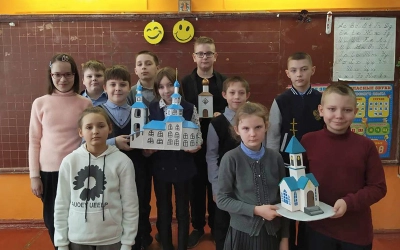 Тема урока - устройство и занчение православного храма. Священник объяснил ребятам на примере символов архитектурные особенности и значение богослужения. Так же он рассказал о присутствии в православии всех видов искусства: архитектуры, литературы, музыки, живописи.