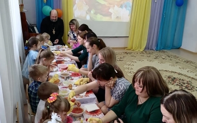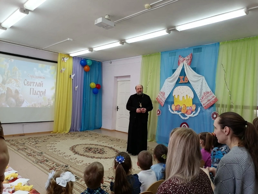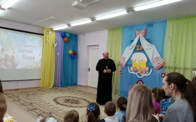 В рамках семейного клуба «Заботливые родители» во второй младшей группе «Солнышко» МБДОУ №4 г. Вязьмы прошло открытое мероприятие «Светлый праздник - Пасха», на котором присутствовал руководитель отдела религиозного образования и катехизации Протоирей Олег Переверзев.