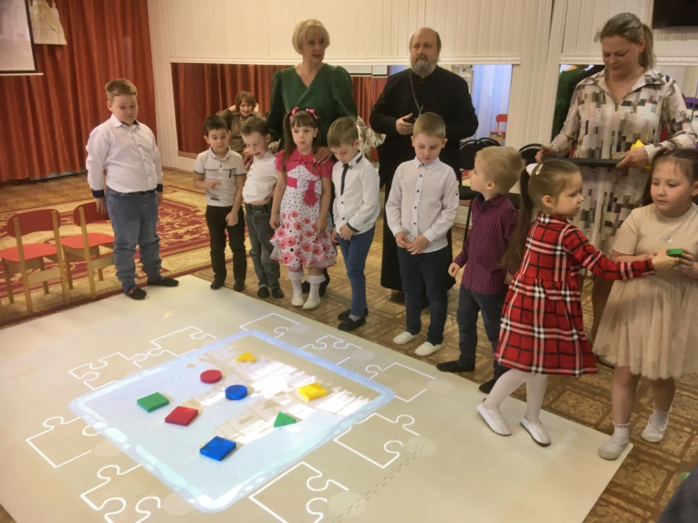 Авторы занятия – группа педагогов детского сада №10, воспитатели и музыкальный руководитель. Педагоги творчески подошли в реализации цели - обогащение внутреннего мира детей, через приобщение к церковному искусству. Они познакомили детей с понятиями духовная поэзия, духовная живопись, духовная музыка, архитектура храмов. Грамотно, в доступной для детей форме, педагоги использовали интеграцию различных методических приемов: рассказ воспитателя, вовлечение детей в диалог, дидактическое упражнение «Определи жанры живописи», слушание аудио-фрагментов из духовной поэзии и музыки, чтение стихов детьми и пение, музыкальная игра «Угадай духовную музыку», виртуальная экскурсия «С чего все начиналось» на примере архитектуры зданий храмов родного города. Необычным стало превращение дошкольников в юных архитекторов в конструктивной игре «Построй храм» на интерактивном «умном полу» Magium. Результат интерактивной игры – возведение Троицкого собора.
