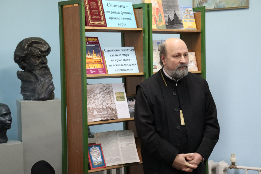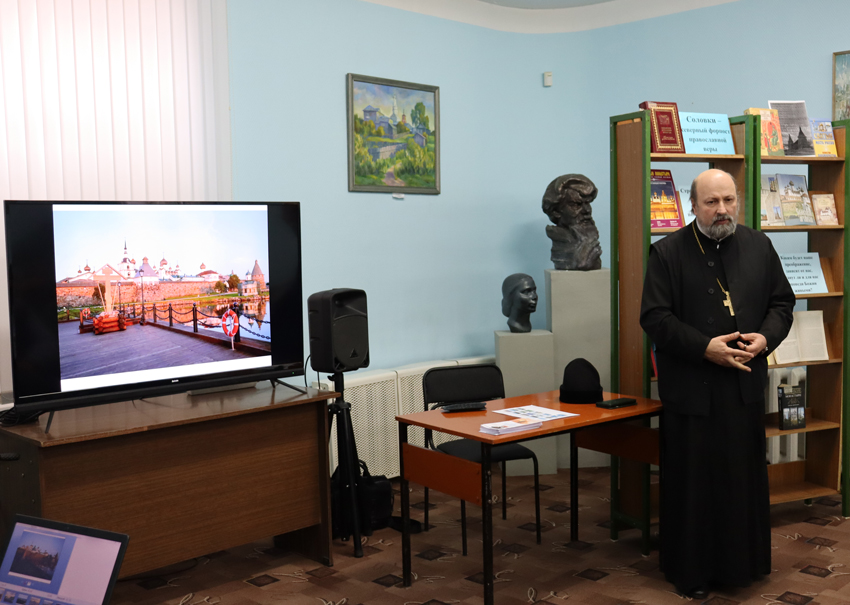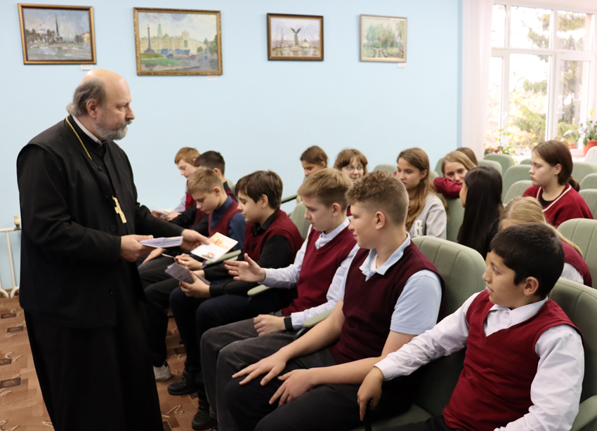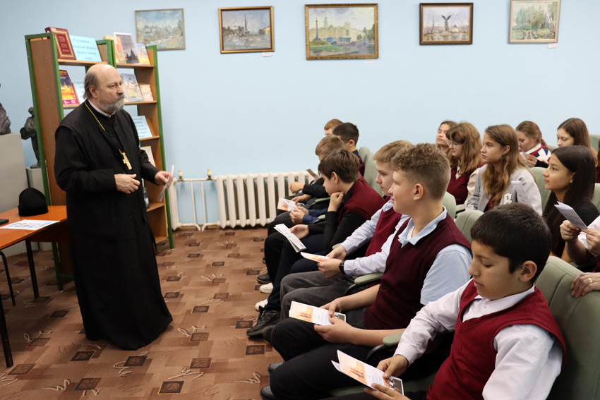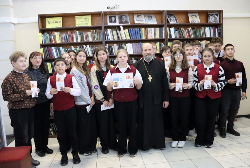 21 октября 2025 года настоятель Введенской церкви гю Вязьмы провел беседу с учащимися 8-х классов МБОУ СОШ №4 в Вяземской центральной библиотеке на тему "Святые обители России. Монастыри Смоленской земли".