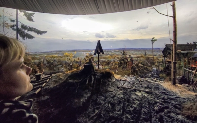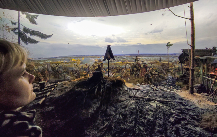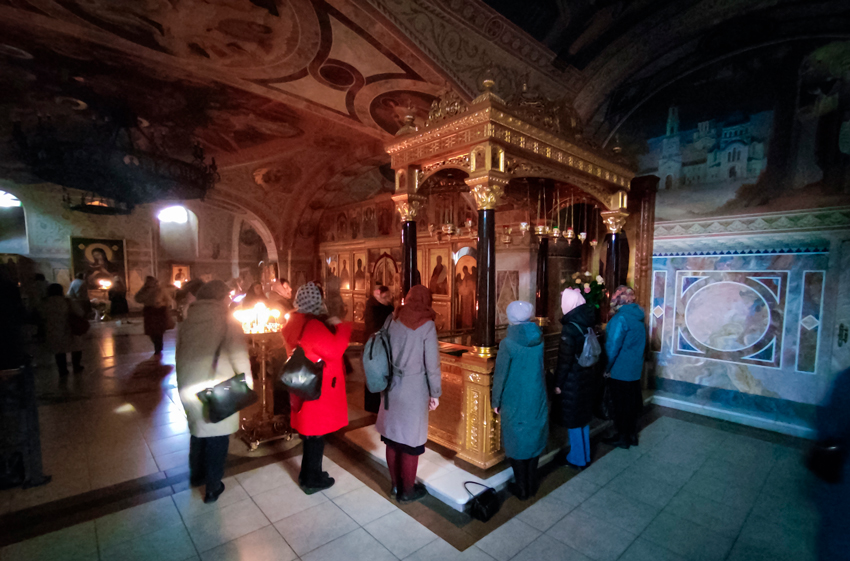 Осмотрев храмы обители и помолившись у могилы преподобного Тихона, паломники направились в замечательное место — Свято-Владимирский скит, на место, которое известно в истории России как Великое стояние на Угре. Некогда пустынное место, забытое на несколько веков потомками героев, вставших на защиту нашей Родины в 1480 году против мощной армии хана Ахмата, превратилось за несколько лет в замечательный скитский комплекс. На территории скита создан музей диорамы «Великое стояние на Угре», написанной знаменитым художником Павлом Рыженко (+16 июля 2014). Долго стояли, глядя на это замечательное произведение искусства, и восхищались впечатлением будто бы явного присутствия в том самом моменте истории!