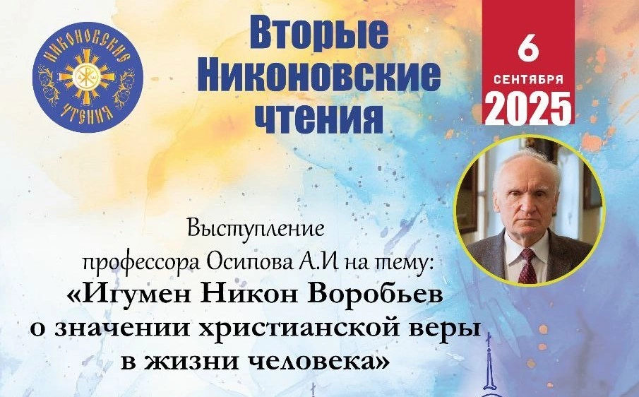 6 сентября 2025 года в ЦДТ "Звёздный" города Гагарин в рамках II Никоновских чтений состоится выступление профессора Осипова А. И. на тему: "Игумен Никон Воробьёв о значении христианской веры в жизни человека".