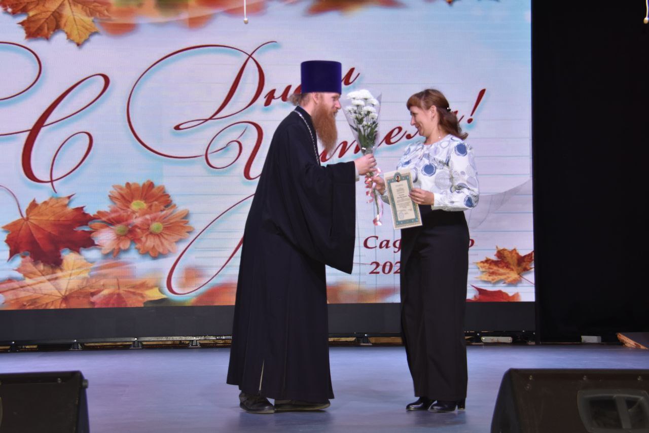 2 октябрям 2025 года в Центральном дворце культуры прошло торжественное мероприятие, посвящённое Дню учителя. Поздравить педагогов с профессиональным праздником пришёл благочинный Сафоновского округа иерей Сергий Чайкин.