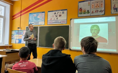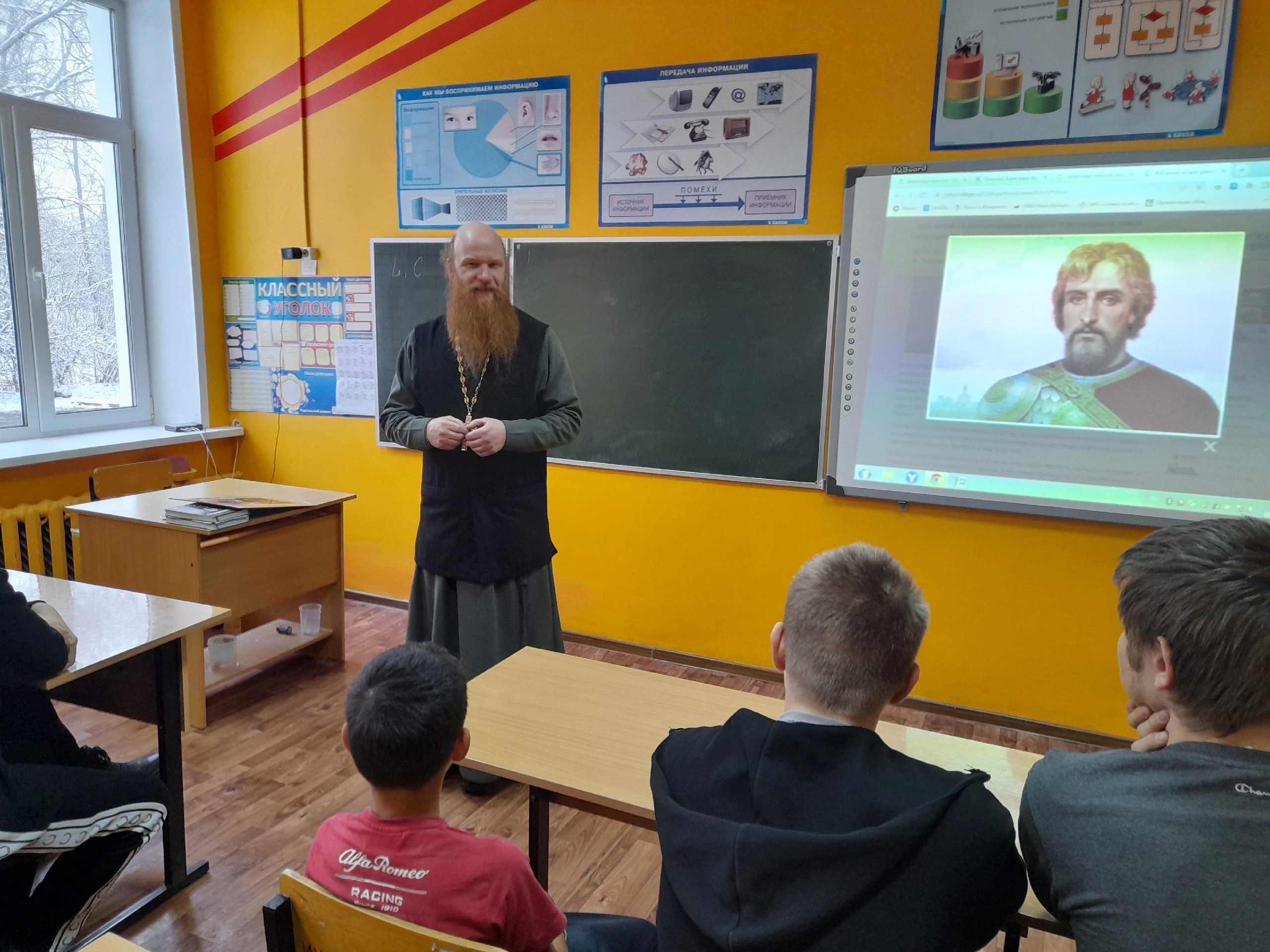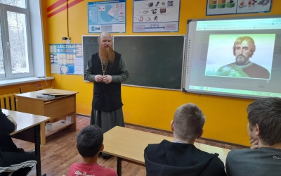 Отец благочинный предложил ребятам поразмышлять над темой святости. Взяв за основу жизненный путь и подвиг святого князя Александра Невского, священник показал, как человек, идущий трудным, но благодатным путём духовного возрастания, служения ближним и Отечеству, становится ближе к Богу.
