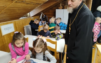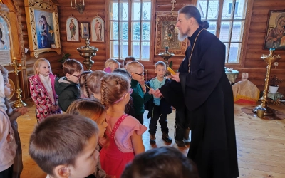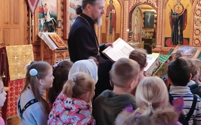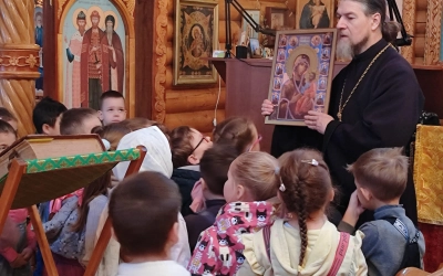 Настоятель храма, иерей Владимир Иванов, рассказал маленьким христианам о храме и его устройстве, о иконах, молитве, Иисусе Христе и Богородице, о ангелах и святых угодниках.