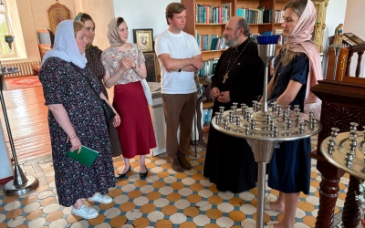 В храме Введения Пресвятой Богородицы делегацию встретил настоятель протоиерей Олег Переверзев. Священник провел экскурсию по храму, рассказал о жизни прихода, показал дом, где родился будущий святой, ответил на многочисленные вопросы паломников.