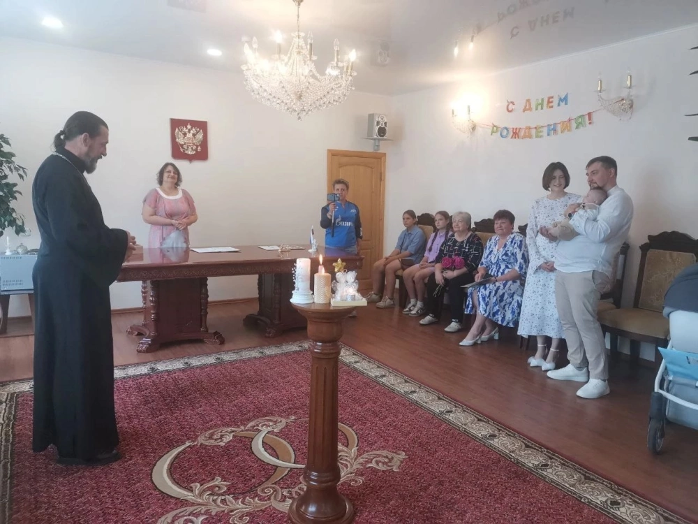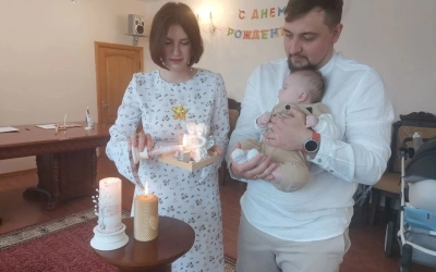 В молодой семье педагогов Муравьевых Никиты и Алины появился первенец - сын Федор, что в переводе с древнегреческого означает «Божий дар» или «дарованный Богом». На церемонии малыш вел себя очень достойно, находясь в сильных мужских отцовских руках, которые с нежностью прижимали свое сокровище к груди.