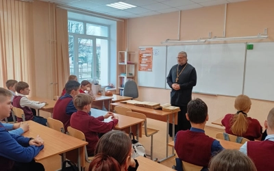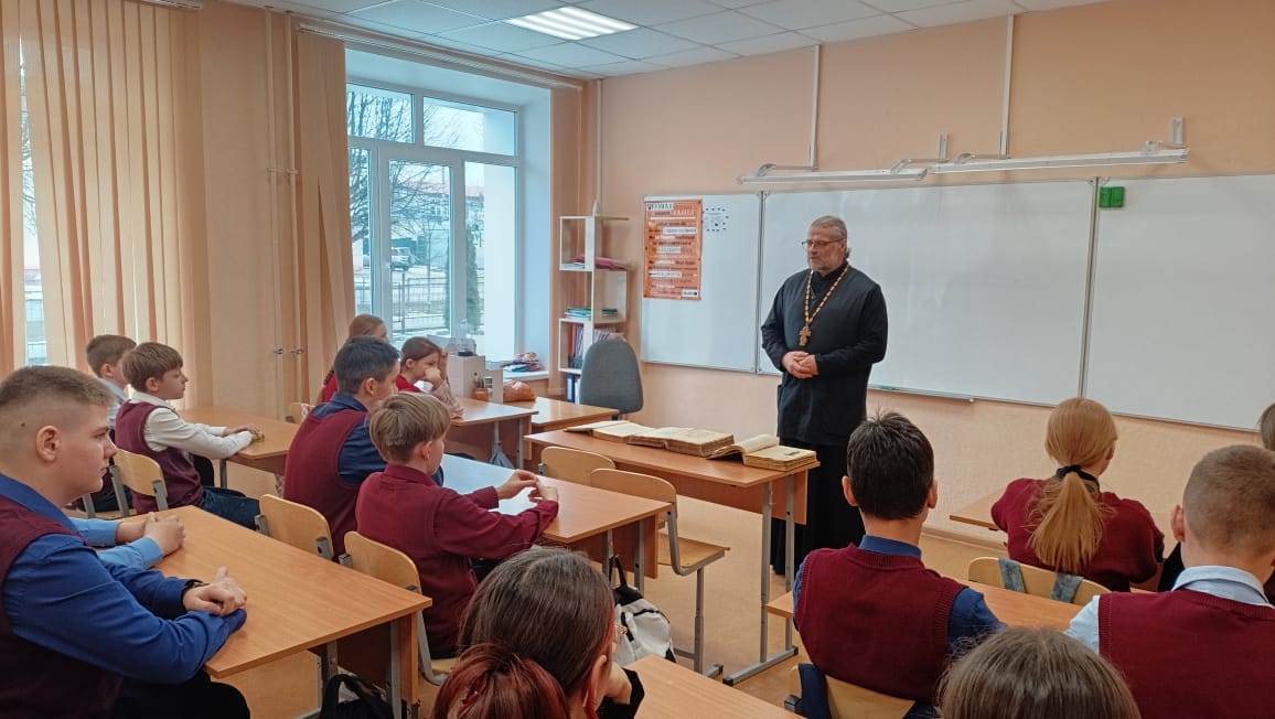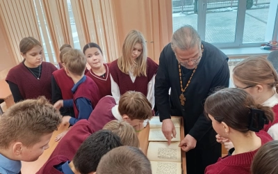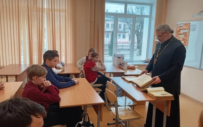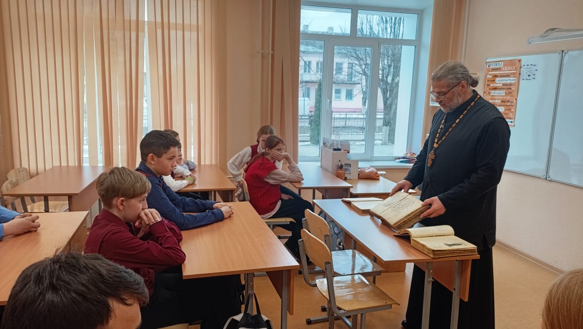 19 марта 2025 года в рамках празднования Дня Православной Книге, благочинный Вяземского округа протоиерей Валерий Калинин провел занятие с учениками 6-го класса 4-ой средней школы города Вязьмы. Священник рассказал о святых Кирилле и Мефодии, о начале книгопечатания на Руси и значении книги для современного человека.