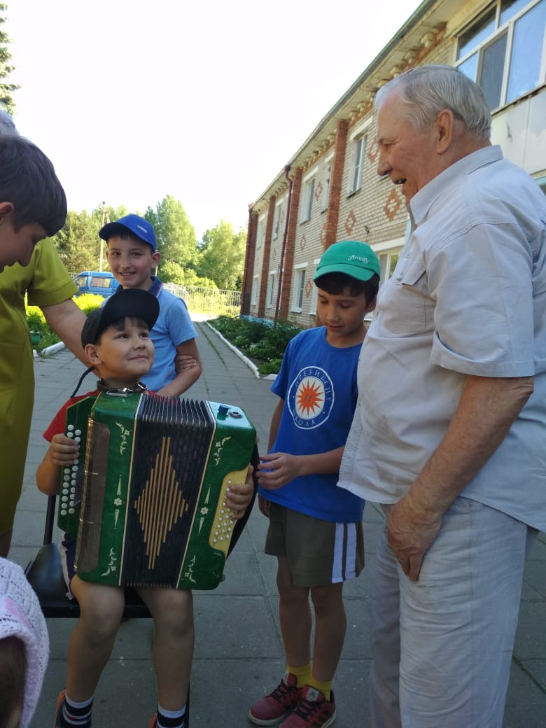 - член союза гармонистов России Иван Аникеевич Зубарев исполнил для детей музыкальные произведения на гармоне.