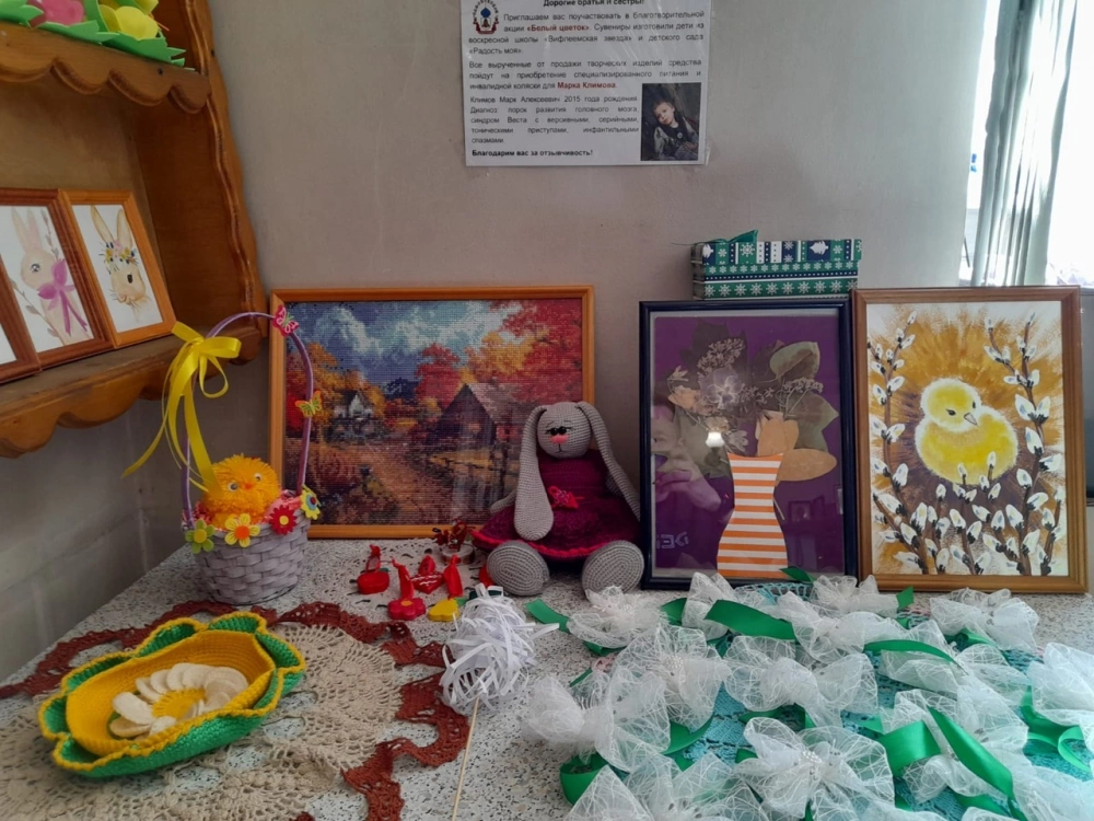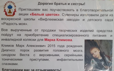 6 апреля, накануне великого праздника Благовещения Пресвятой Богородицы в храме Рождества Христова г.Сафоново стартовала благотворительная акция "БЕЛЫЙ ЦВЕТОК". Сувениры для акции изготовили дети из воскресной школы "Вифлеемская звезда" и детского сада "Радость моя". Все вырученные от продажи творческих изделий средства пойдут на приобретение специализированного питания и инвалидной коляски для МАРКА КЛИМОВА.