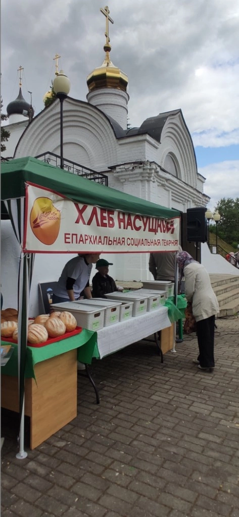 В одном из павильонов,разместившихся на площадке перед часовней в честь преподобного Аркадия Вяземского, можно было приобрести продукцию епархиальной социальной пекарни «Хлеб насущный» -хлеб и хлебобулочные изделия. Все вырученные средства будут направлены по благословению епископа Вяземского и Гагаринского Сергия на оказание помощи шестнадцатилетней Евгении Иксаковой из п.Новый Вяземского района. Евгения перенесла срочную операцию по трансплантации печени из-за цирроза 4 степени неизвестной этиологии, сейчас ей требуется реабилитация и дальнейшее лечение. Сбор средств наоказание помощи Евгенииосуществлялся в ходе ярмарки и волонтёрами социально-молодёжного центра «Серафимово подворье» под руководством Голубковой О.С., руководителя Координационного центра по добровольческой деятельности Вяземской епархии.