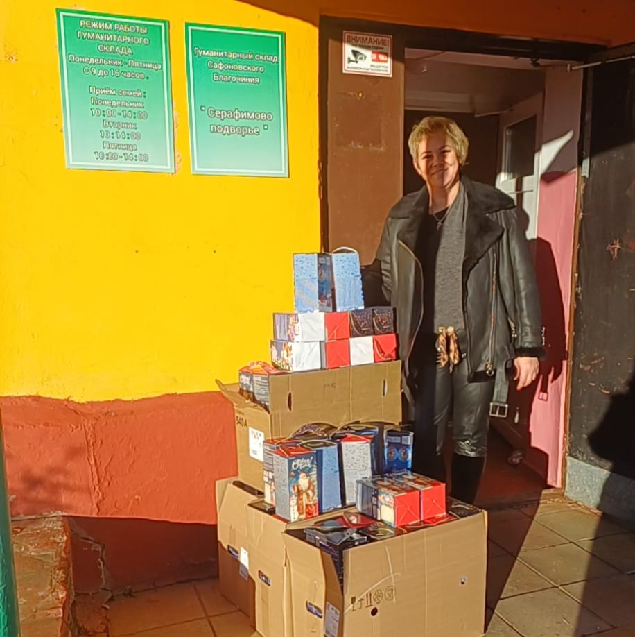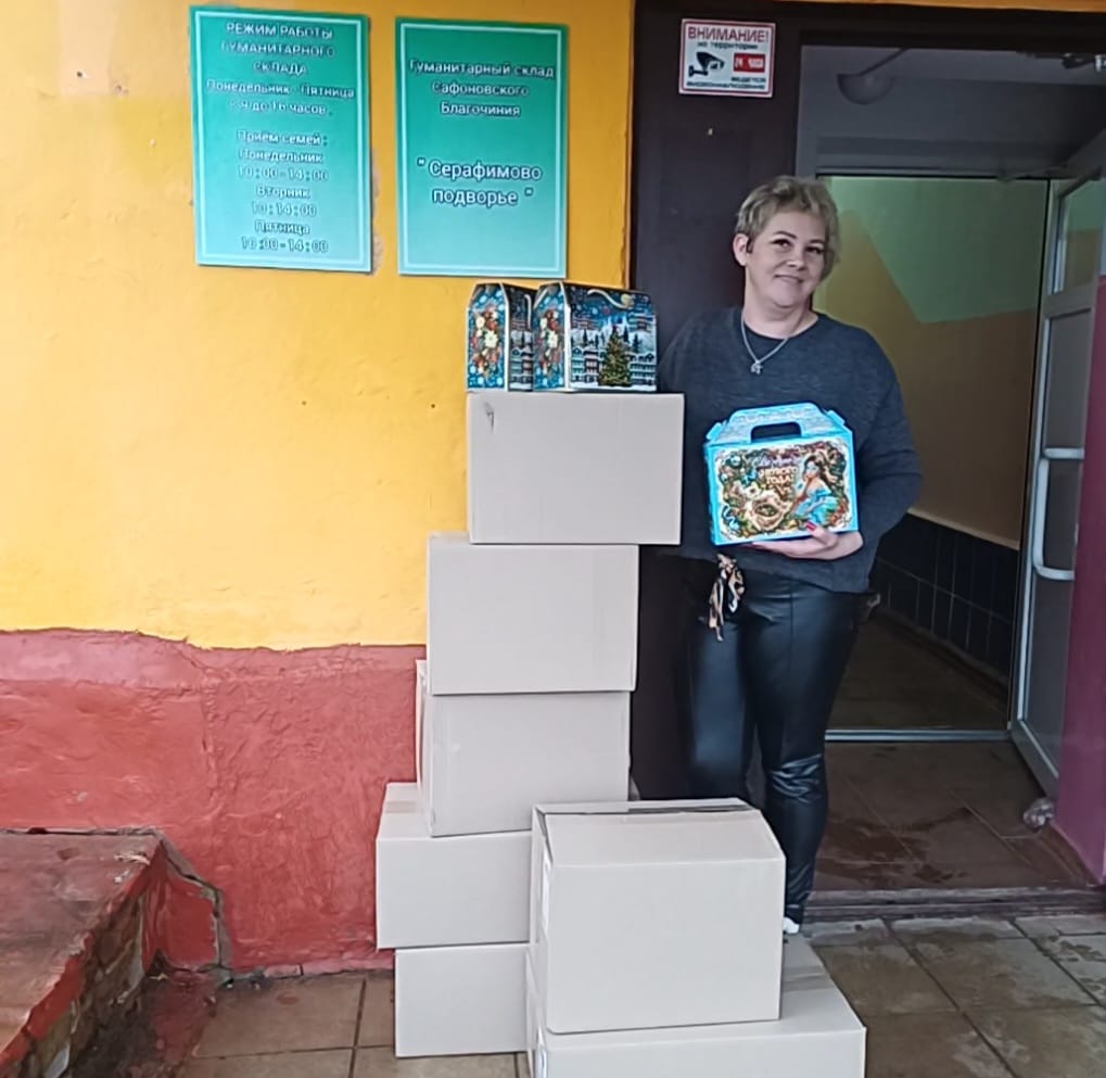 На гуманитарном складе Сафоновского благочиния «Серафимовы подворья» — суета, подготовка к новогодним и рождественским мероприятиям.