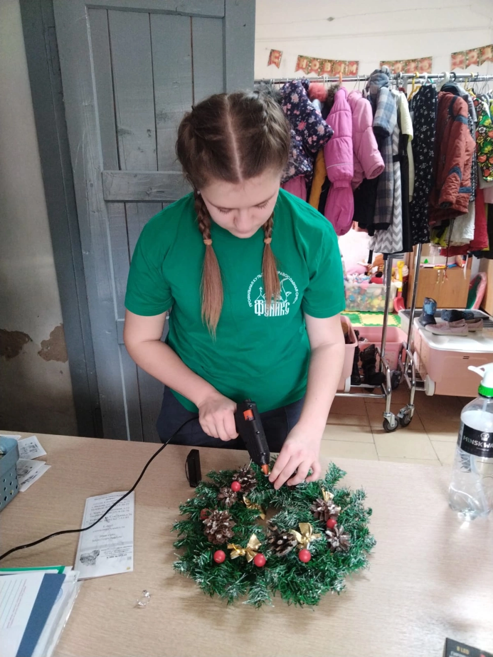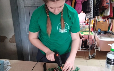Каждый взял на себя важную задачу: кто-то развешивал яркие гирлянды на стенах, кто-то мастерски создавал рождественский венок, а самые юные помощники с интересом украшали пушистую ёлочку.