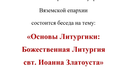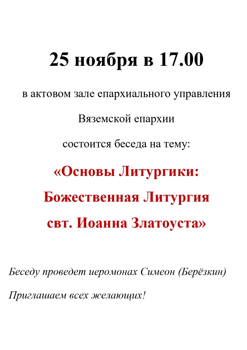25 ноября в 17.00 в актовом зале епархиального управления Вяземской епархии состоится беседа с иеромонахом Симеоном (Берёзкиным) на тему: «Основы Литургики: Божественная Литургия свт. Иоанна Златоуста». Приглашаем всех желающих!