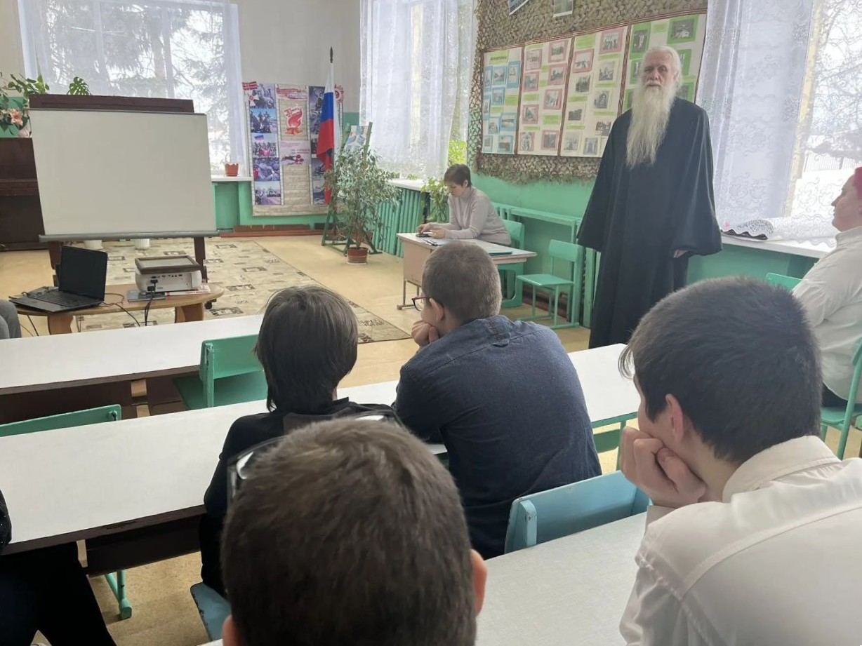 Благочинный Сычевского церковного округа протоиерей Анатолий Чайкин продолжил встречу, поздравил ребят с праздником и ответил на их вопросы.