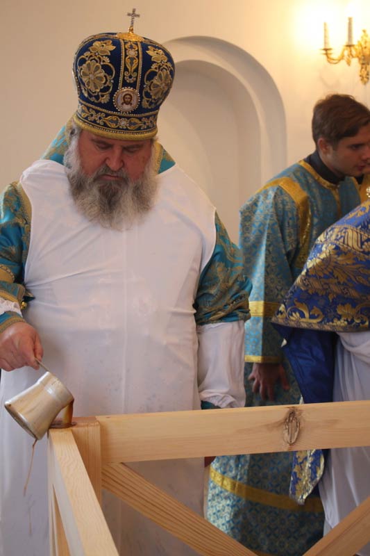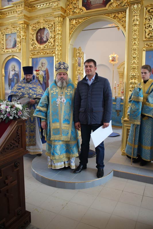 Обращаясь ко всем присутствующим Его Преосвященство поздравил всех с праздником Покрова Пресвятой Владычицы нашей Богородицы и Приснодевы Марии, освящением храма: