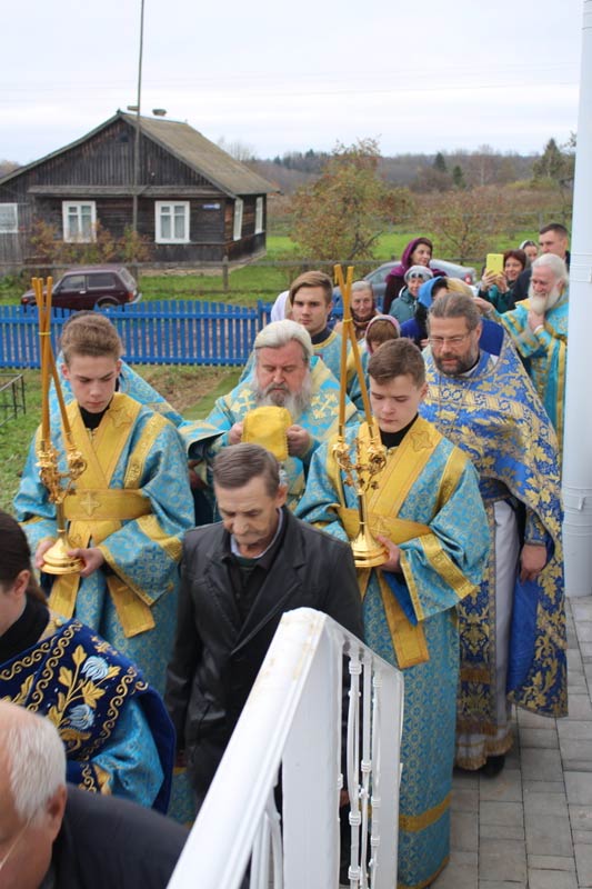 С особой торжественность епископ Вяземский и Гагаринский Сергий совершил освящение храма в честь Покрова Пресвятой Богородицы. Был совершен крестный ход со святыми мощами вокруг храма. Радость была у всех молящихся,- в селе возродился храм. Вновь будут возноситься святые молитвы ко Господу. Епископ Сергий назначил в храм настоятеля о. Павла Ковалева, для которого построен дом священника. Первые причастники в этот праздничный день причастились Святых Христовых Тайн.
