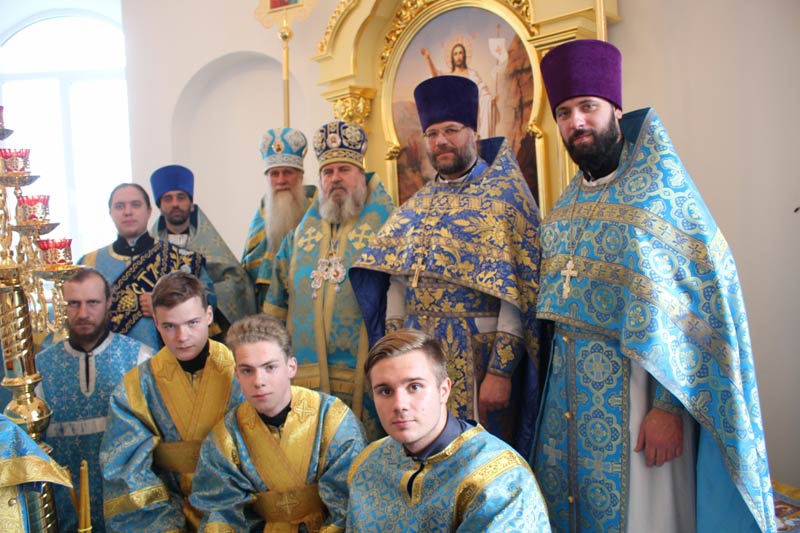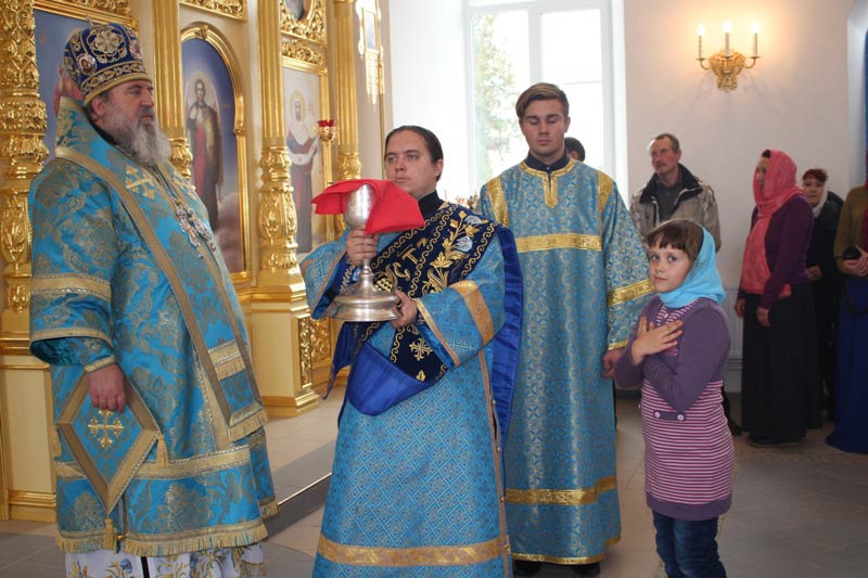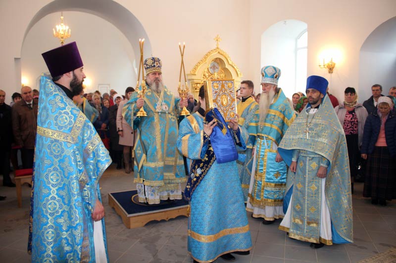 «Всех вас, дорогие отцы, братья и сестры, всех благотворителей строителей, благоукрасителей храма, руководителей органов государственной власти, руководителей органов местного самоуправления с праздником Покрова Пресвятой Владычицы нашей Богородицы и Приснодевы Марии и освящением храма в честь сего праздника. Из истории мы хорошо знаем, что корни этого праздника исходят из города Константинополя – из Царь-града. Когда этот град был окружен неприятельскими войсками и всем грозила погибель, горожане в страхе собрались во Влахернском храме на всенощное бдение и долго преклонив колена, молились Господу нашему Иисусу Христу и Пресвятой Богородице. Они знали, что во храме издревле хранится риза и мофорий (головное покрывало) Пресвятой Богородицы. Богослужение продолжалось всю ночь. И в четвертом часу утра святой блаженный Христа ради юродивый Андрей увидел дивное видение. Он увидел как во храм на воздусе, вошла Сама Пресвятая Богородица, сопровождаемая Иоанном Крестителем, апостолом и евангелистом Иоанном Богословом, множеством ангелов и святых. Пресвятая Богородица, преклонив свои колена, долго, долго молилась о храме, народе и городе. По окончании молитв Она сняла с себя мофорий и распростерла его над народом и градом как знак Своего покровительства и заступничества. Святой Андрей спросил стоящего рядом своего ученика Епифания: «Видишь ли ты что, Епифаний?» «Вижу, отче святый, и ужасаюся!». Таково было явление Божией Матери. Она дала явный знак Своего присутствия в этом мире, дала явный знак Своего покровительства и над Константинополем и над всей землей.