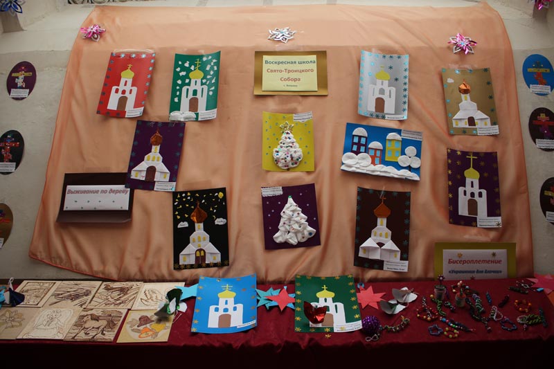 Украшением праздника явилась выставка творчества учащихся воскресной школы, созданная на занятиях рукоделия у преподавателя Гуторовой Галины Дмитриевны.