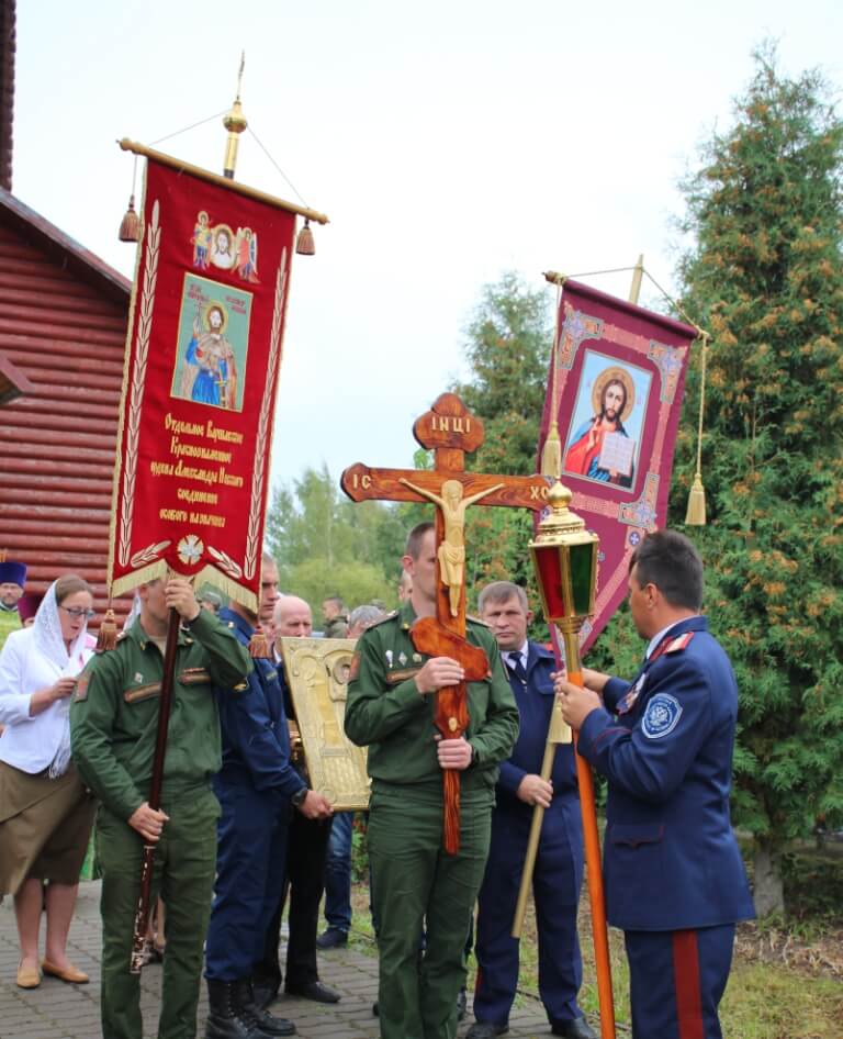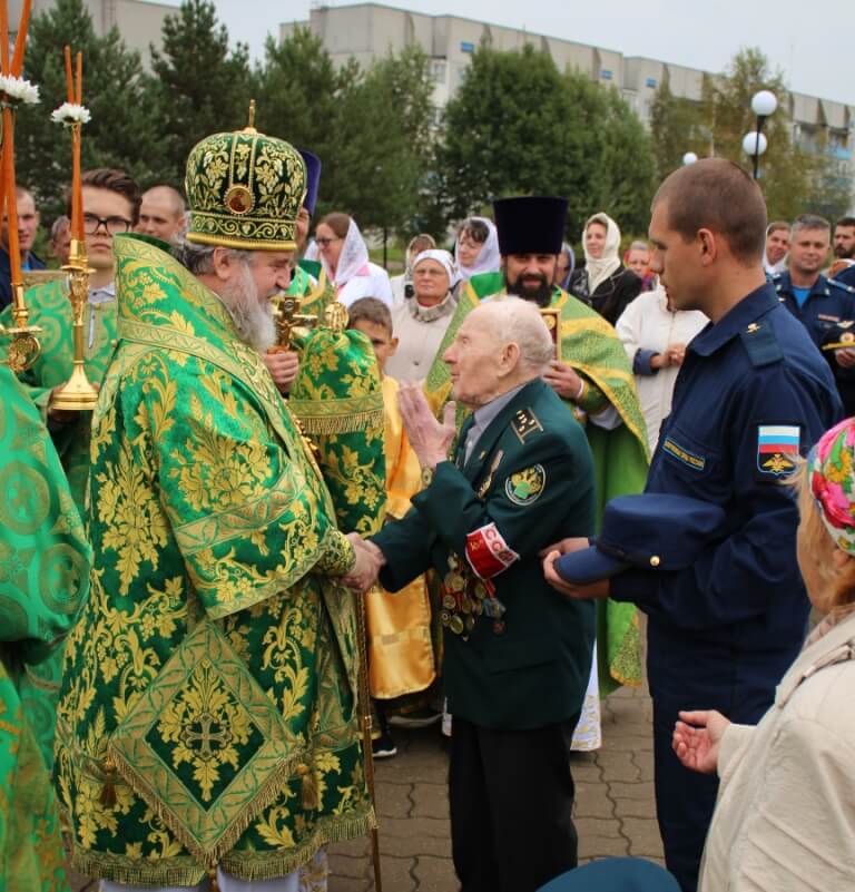 После Божественной литургии был совершён Крестный ход, во время которого была отслужена лития у памятного мемориала воинам отдавшим жизни свои за Отечество.