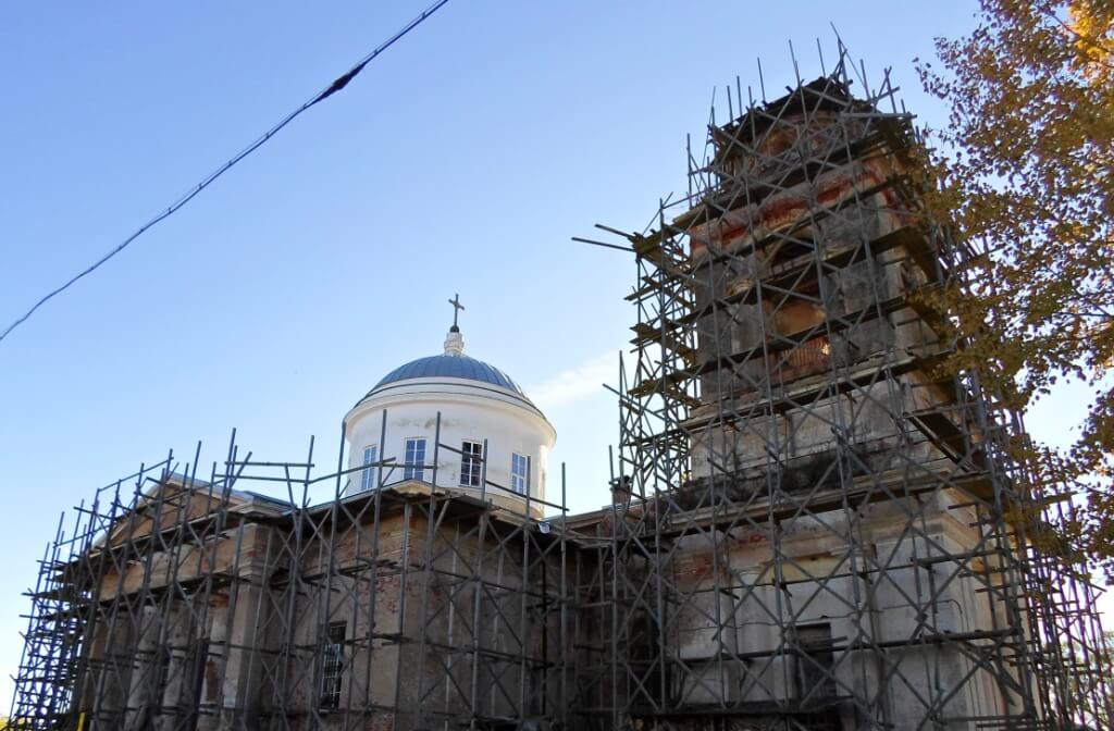 Строительство Храма началось в 1828 году помещицей Анастасией Михайловной Олонкиной, а закончилось при её внуке в 1841 году. В храме было освящено два придела во имя Святителя Николая Чудотворца и Преподобного Сергия Радонежского. Построена в стиле классицизма с присущей четкостью и геометризмом форм. Четырёхстолпный однокупольный храм с шестиколонными портиками с трёх сторон и двухъярусной колокольней. К кубическому зданию храма примыкают увенчанные фронтонами шестиколонные тосканские портики, а с запада двухъярусная колокольня.