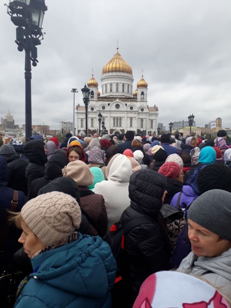 Очередь в Москве к храму Христа Спасителя растянулась на очень большое расстояние. Много людей пришли к храму, чтобы прикоснуться к святым мощам и попросить избавления от болезней и благополучия в жизни. Доступ к мощам открыт с 8 часов утра и до 22 часов вечера. Храм открыт 14 часов для наибольшего посещения верующими.