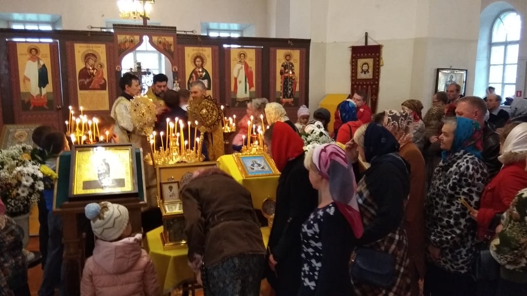 В теплый воскресный осенний день — храм полон народу :сотни православных из г. Гагарин и Гагаринского района пришли приклониться пред Святынями, прибывшими в наш город. Обычно, на воскресной службе храм полупустой, и