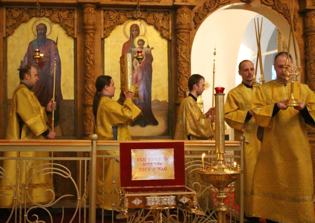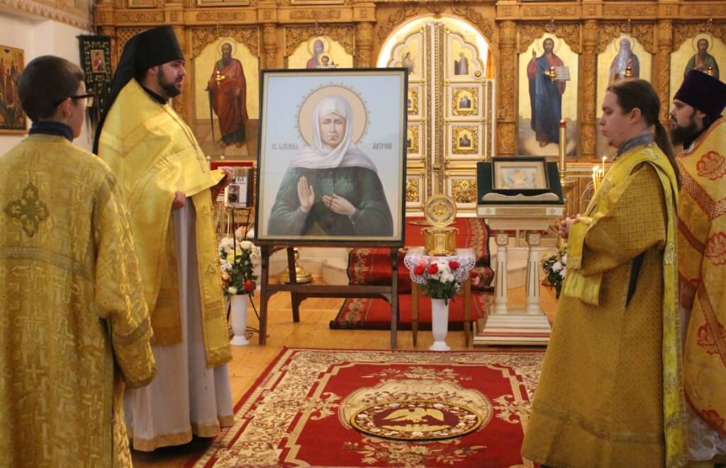 После Причащения верующих, в связи с прибыванием в Свято-Троицком кафедральном соборе частицы мощей Блаженной Матроны Московской, были совершены молитва и славление Святой угоднице Божией.