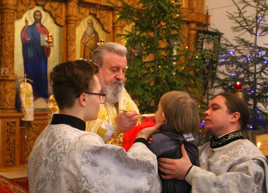 На запричастном стихе клирик собора иеромонах Симеон (Берёзкин) огласил Рождественское послание клиру, монашествующим и мирянам Святейшего Патриарха Московского и всея Руси Кирилла.