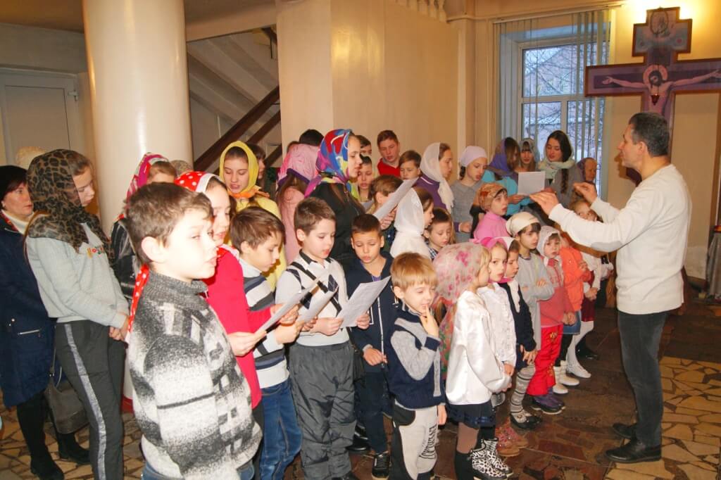За богослужением дети из двух возрастных групп воскресной школы «Вифлеемская звезда» исполнили антифоны – особые богослужебные песнопения, основой которых являются псалмы и Заповеди блаженства, и молитвы Символ веры и Отче наш. Руководил детским хором преподаватель воскресной школы Ю.А. Жуков. Также воспитанники «Вифлеемской звезды» несли послушание в алтаре и проводили фотосъемку.