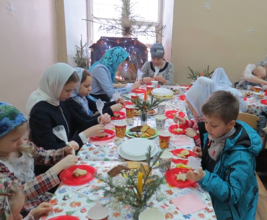 В завершении праздника ребята отправились в трапезную, где их ждал мастер-класс по росписи сахарной глазурью елочных съедобных игрушек - имбирных пряников, после этого юные прихожане отведали необычайно красивый двухъярусный Рождественский торт.