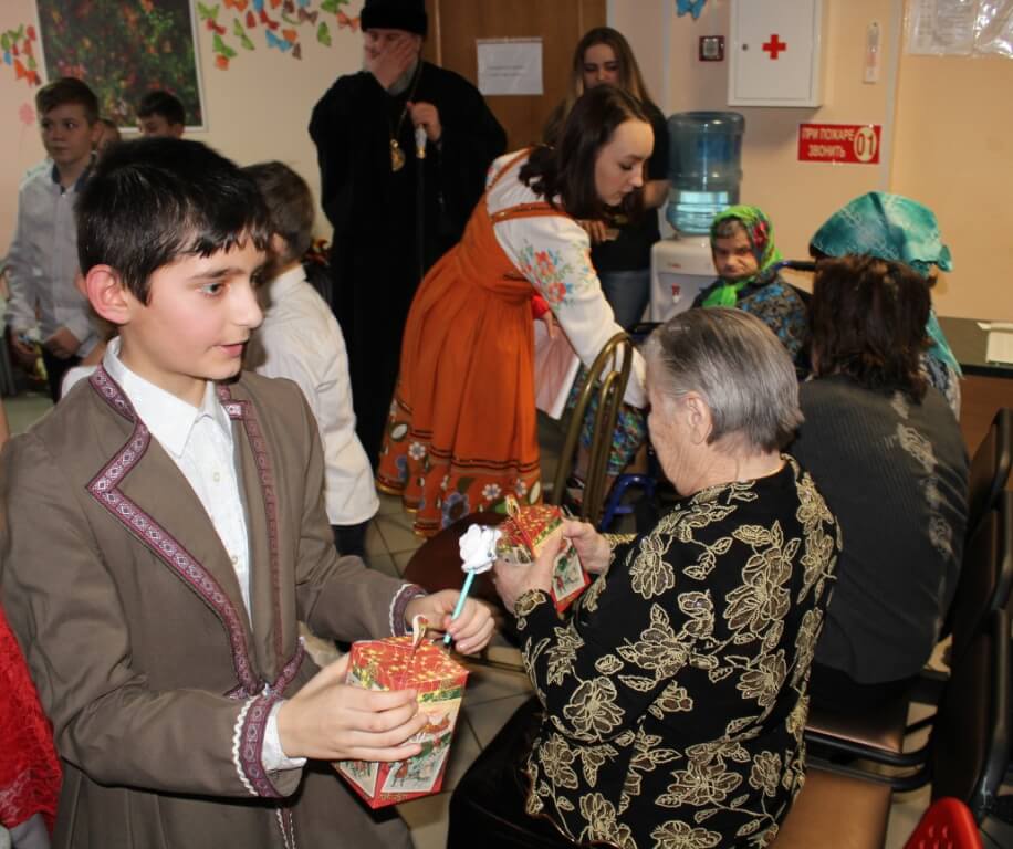 По завершении поздравления Архипастыря, дети поздравили ветеранов с праздниками и вручили от Вяземской епархии каждому по сладкому Рождественскому подарку.