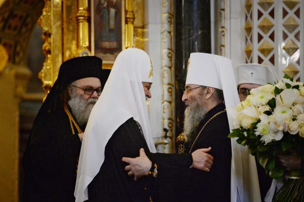 Блаженнейший митрополит Киевский и всея Украины Онуфрий зачитал поздравительный адрес членов Священного Синода Русской Православной Церкви Святейшему Патриарху Кириллу и преподнес Предстоятелю Русской Православной Церкви от Священного Синода памятные дары — предносной крест и комплект из двух панагий и наперсного креста.