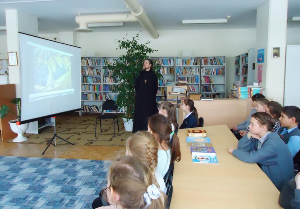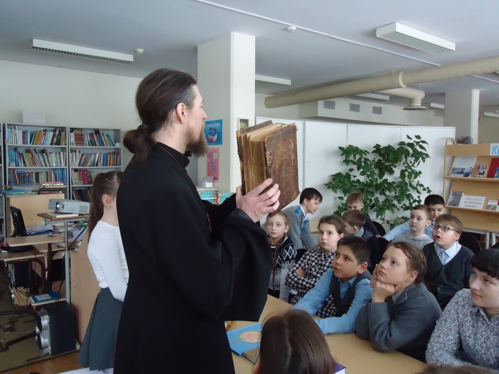На уроках была затронута тема : Кто мы такие русские? Где наши корни ? Что читали наши предки? Первые книги на Руси. Был показан фильм по теме. Священник подарил книги духовного и исторического содержания школьным библиотекам.