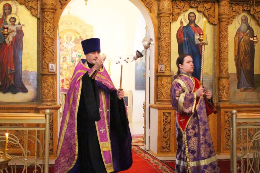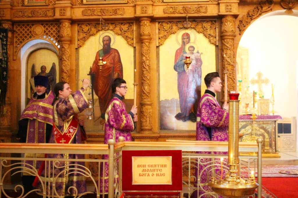 В cубботу вечером на всенощном бдении в центр храма торжественно выносится Животворящий Крест Господень – напоминание о приближающейся Страстной Седмице и Пасхе Христовой. После этого священники и прихожане храма совершают перед крестом три поклона. При поклонении Кресту Церковь поет: “Кресту Твоему покланяемся, Владыко, и святое воскресение Твое славим”. Это песнопение поется и на Литургии вместо Трисвятого.