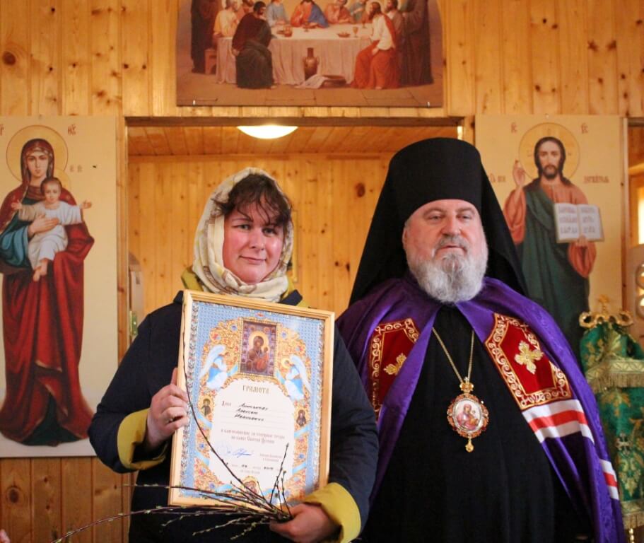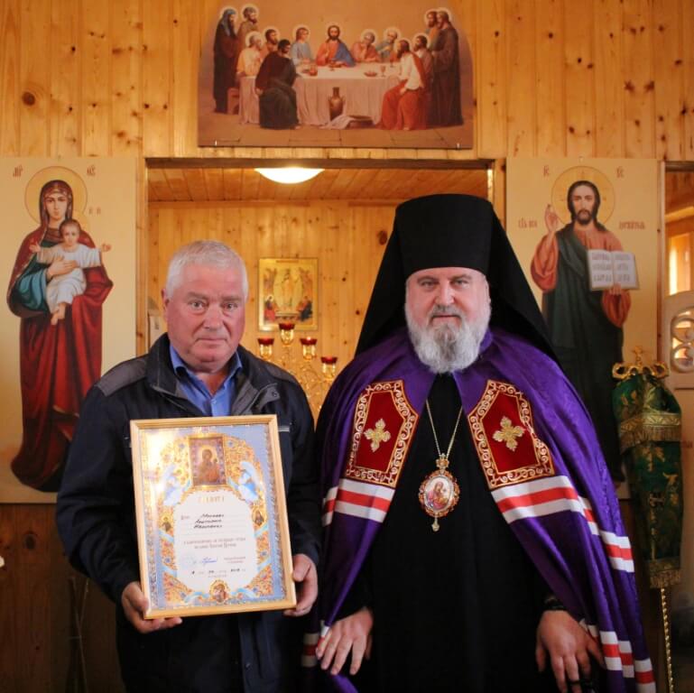 В завершении богослужения владыка Сергий обратился к молящимся с архипастырским словом и поздравил духовенство и всех молящихся за богослужением с освящением храма, а также наградил тех людей которые особенно потрудились в строительстве и благоустройстве храма.