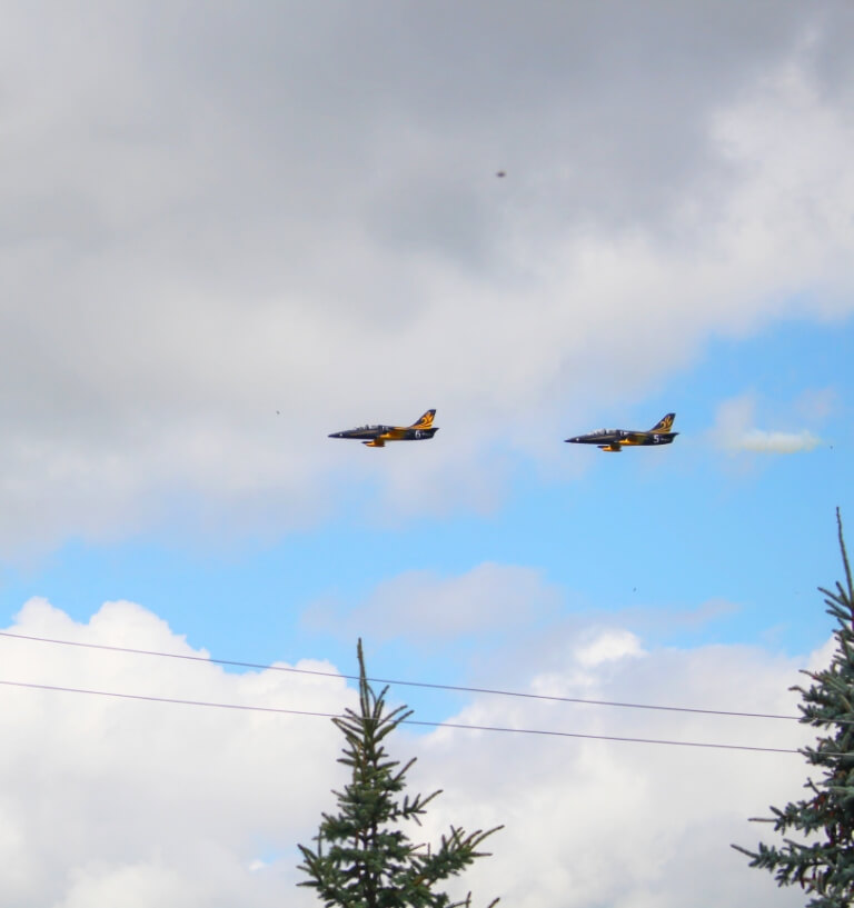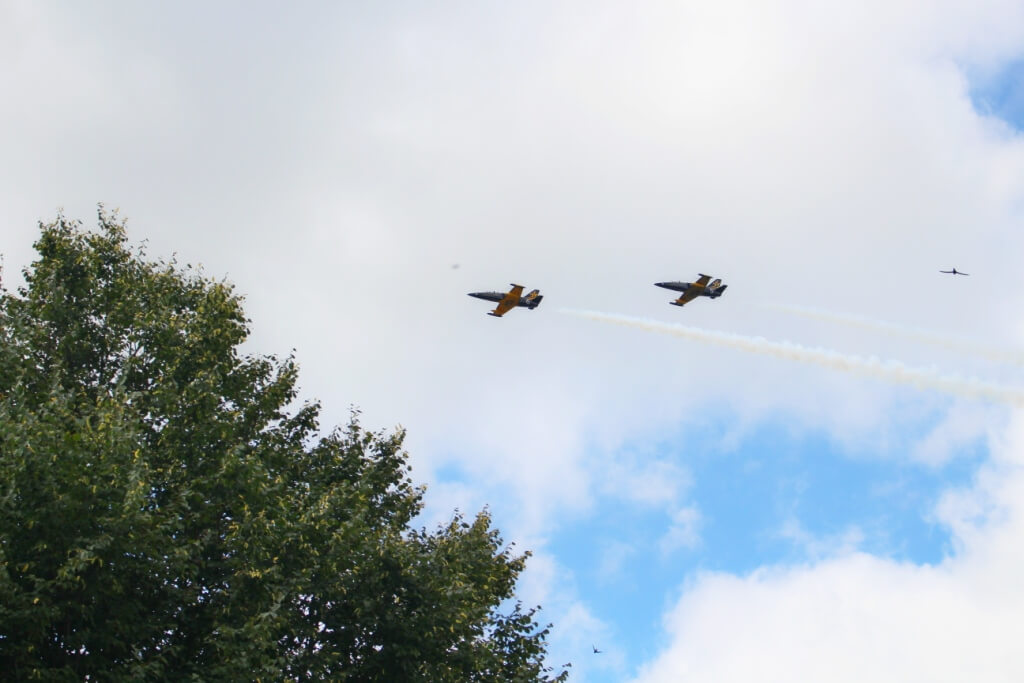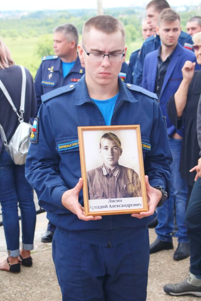 Почтить память героев и проводить в последний путь: Кирсанова Степана Павловича, Стрельникова Михаила Сергеевича и Лисина Аркадия Александровича прибыли два экипажа пилотажной группы "Русь", сделав в воздухе, над гробом с останками воинов три почётных круга.