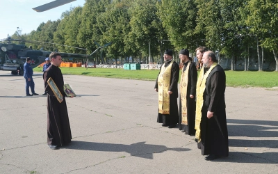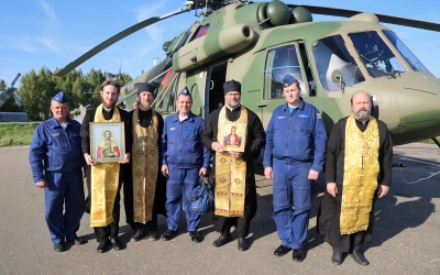 В этот же день был совершен крестный лёт с иконами Пресвятой Богородицы "Неупиваемая Чаша" и святого благоверного Великого князя Александра Невского на вертолёте МИ-8. Вылет разрешил командир воинской части №41687 полковник Скороспехов Игорь Александрович. Он же и пилотировал борт.