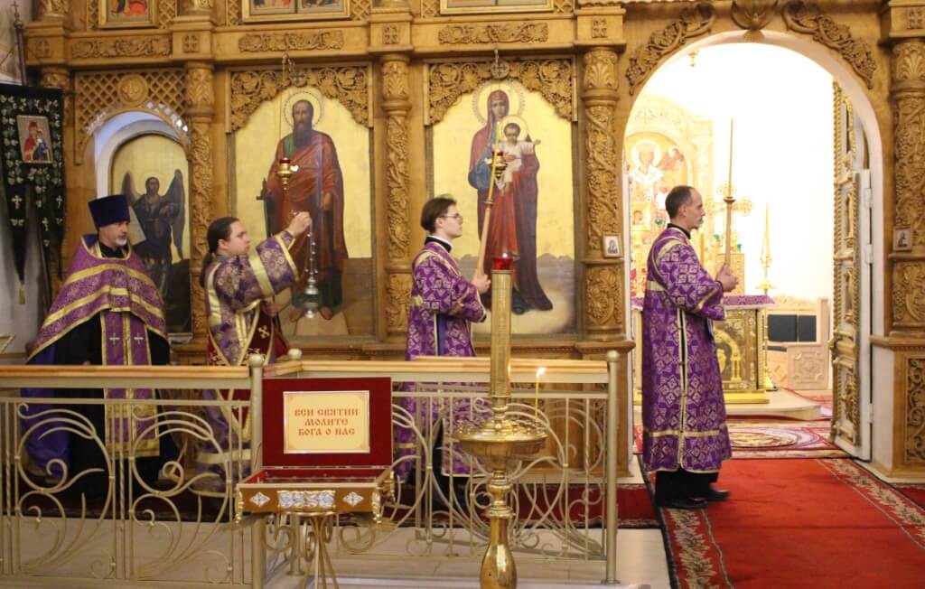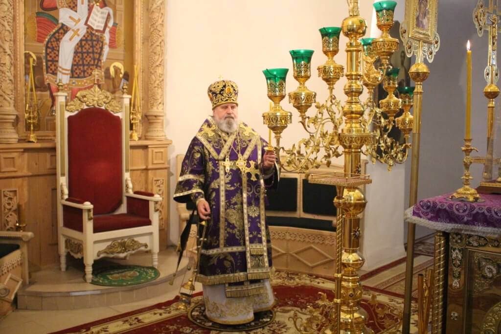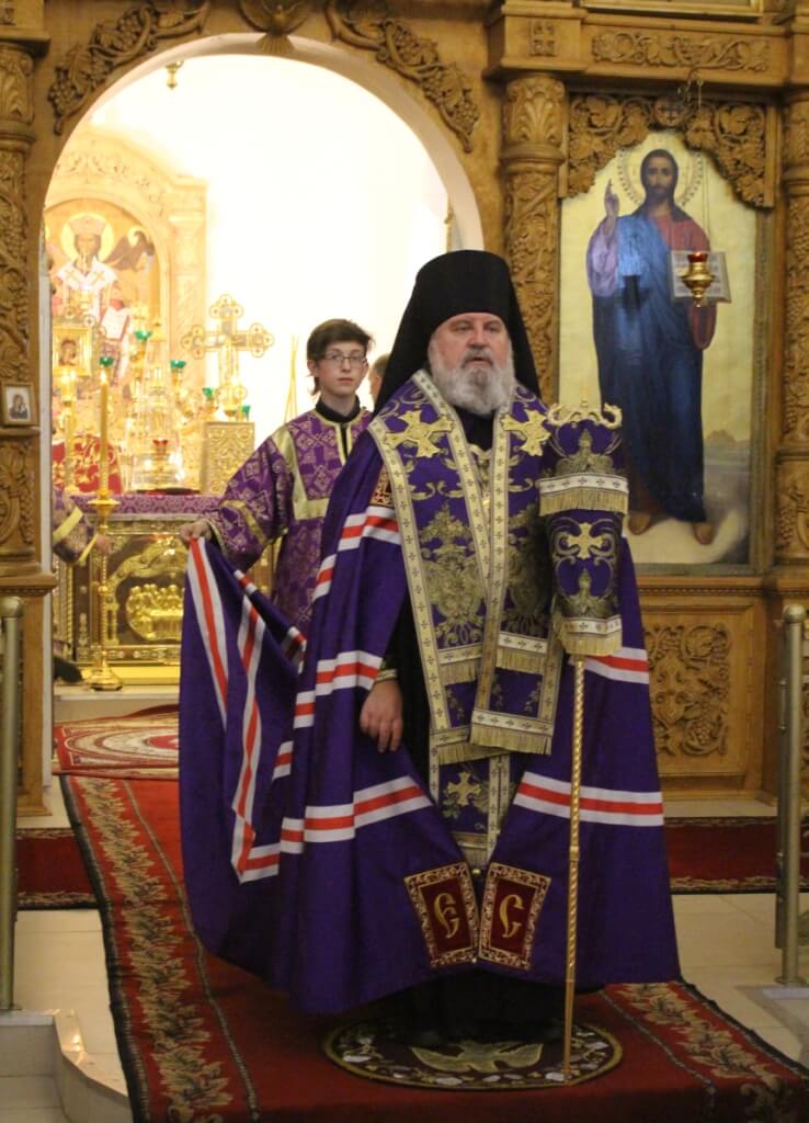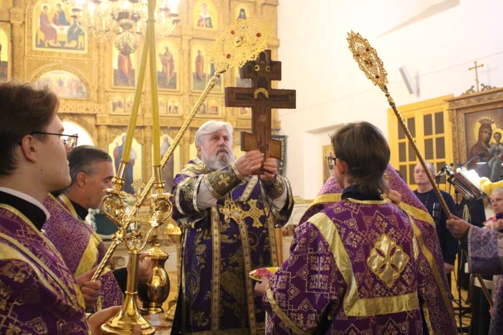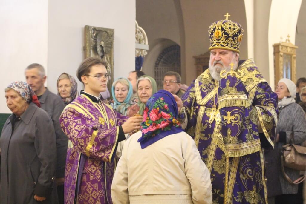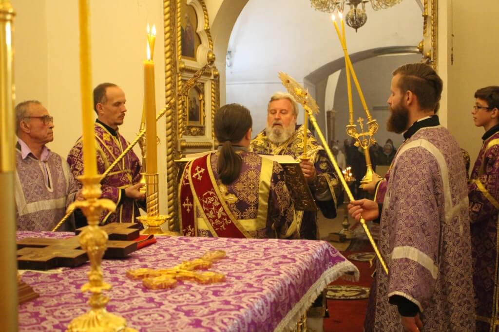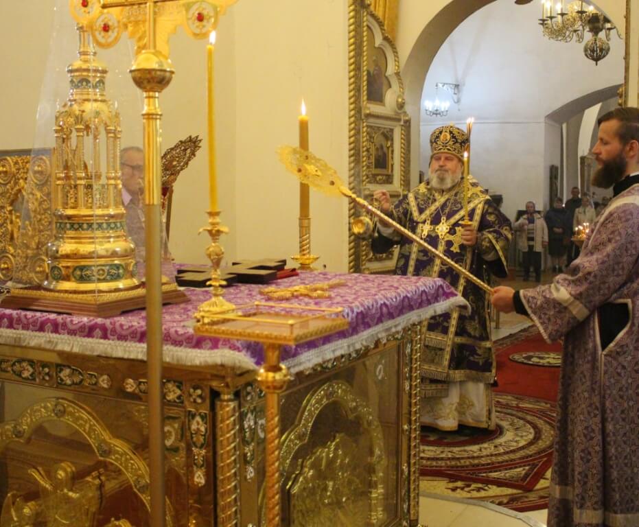 После великого славословия епископ Сергий совместно с духовенством совершил изнесение из алтаря Честного Креста Господня.