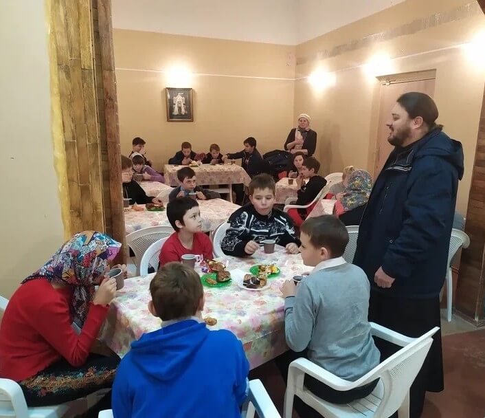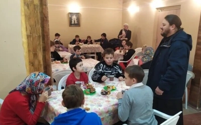 25 детей 4-5 классов встретились с иереем Романом (Ступа) в храме Всех Скорбящих Радости г.Гагарин. За чаепитием дети задавали вопросы о Боге, о плохих и хороших поступках. Отец Роман рассказал детям о Боге, о сотворении мира, о детских грехах, ангелах и аггелах.