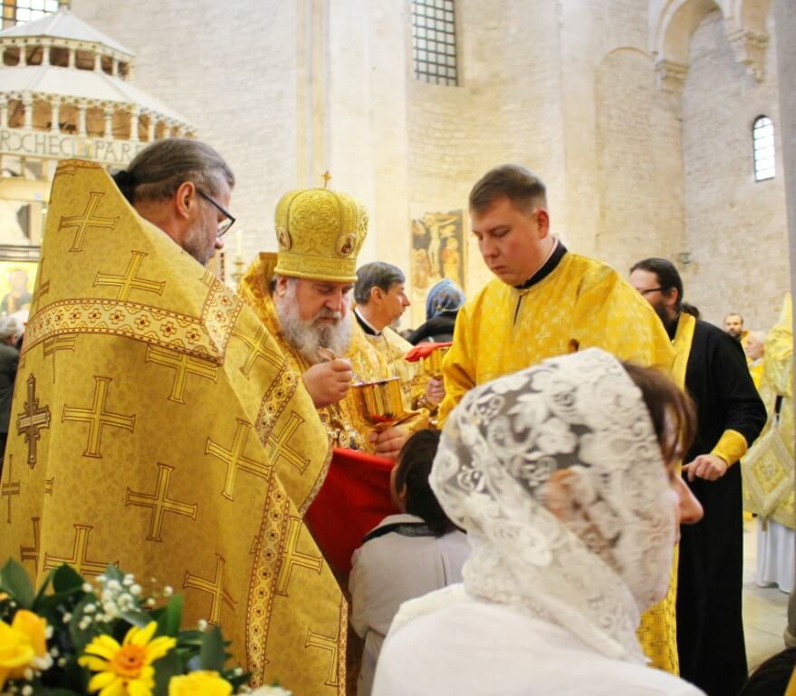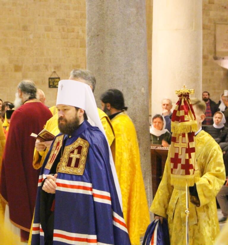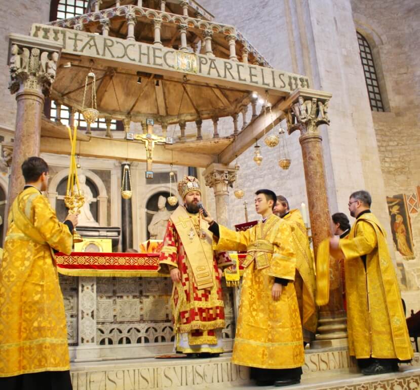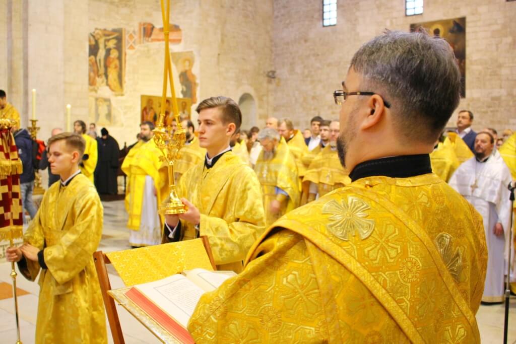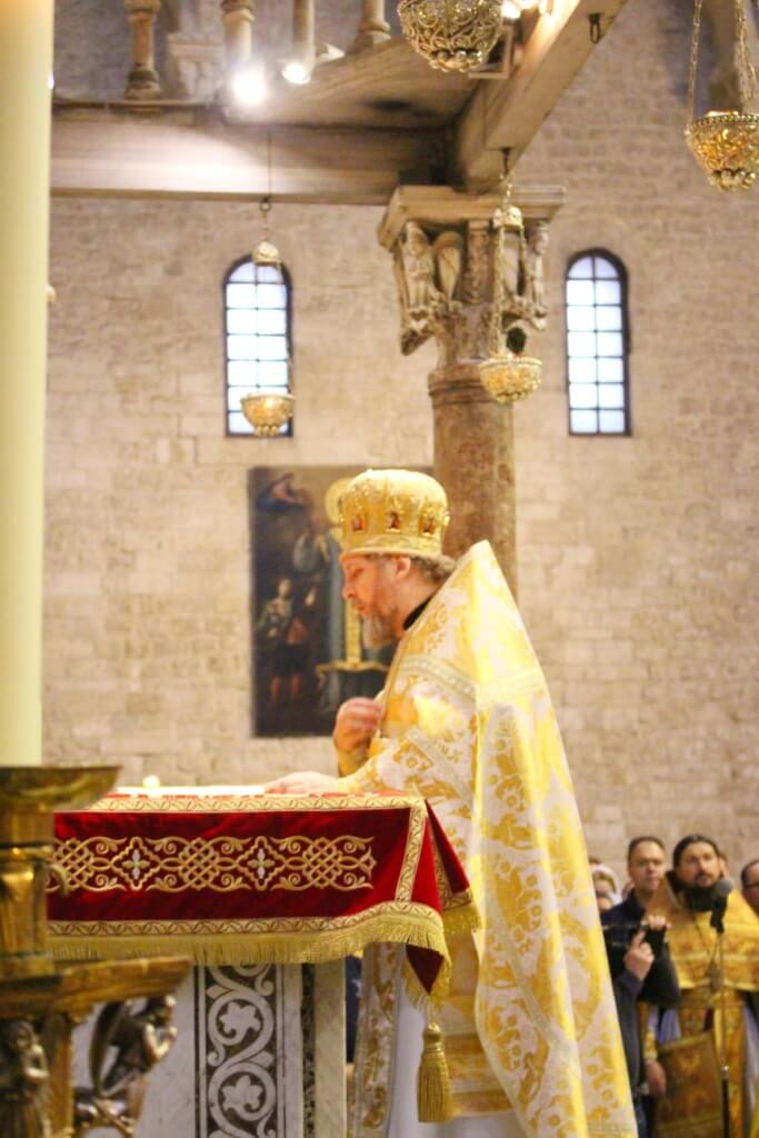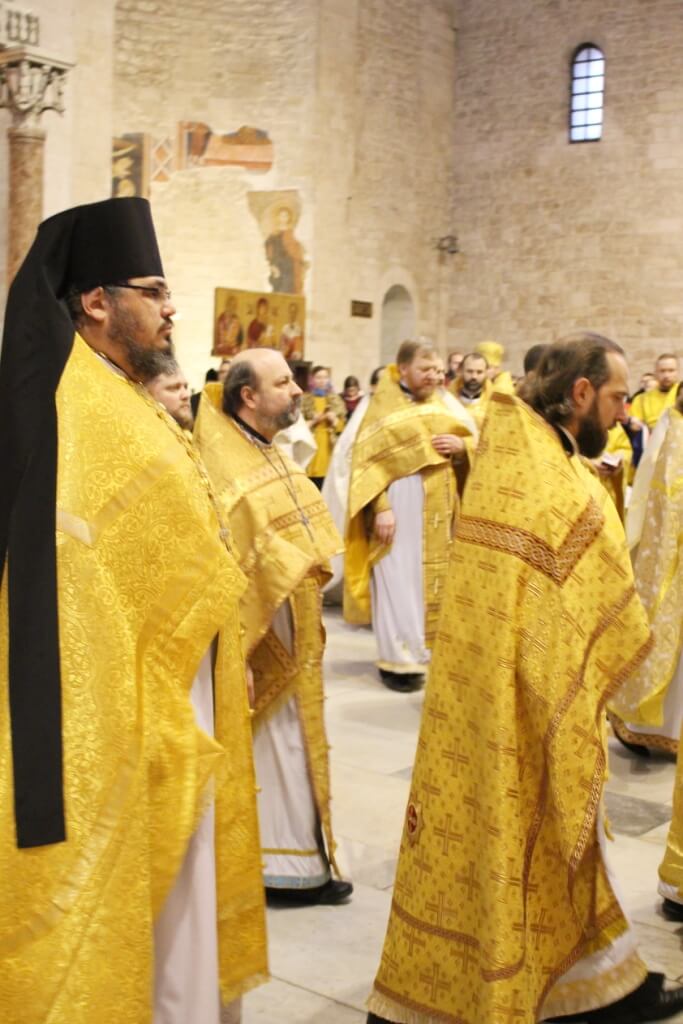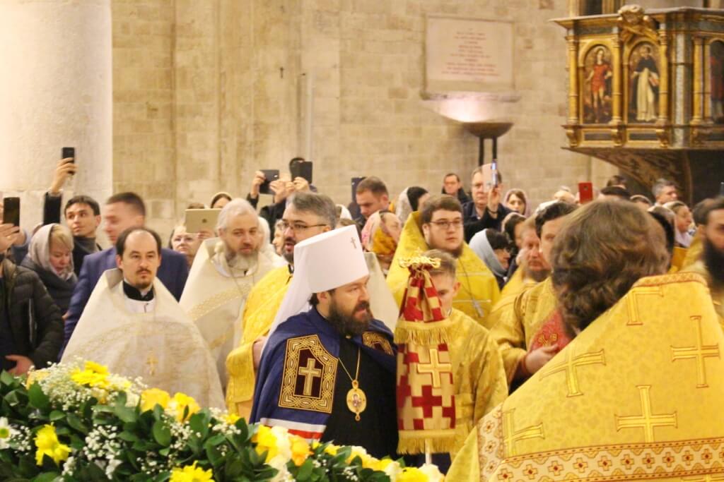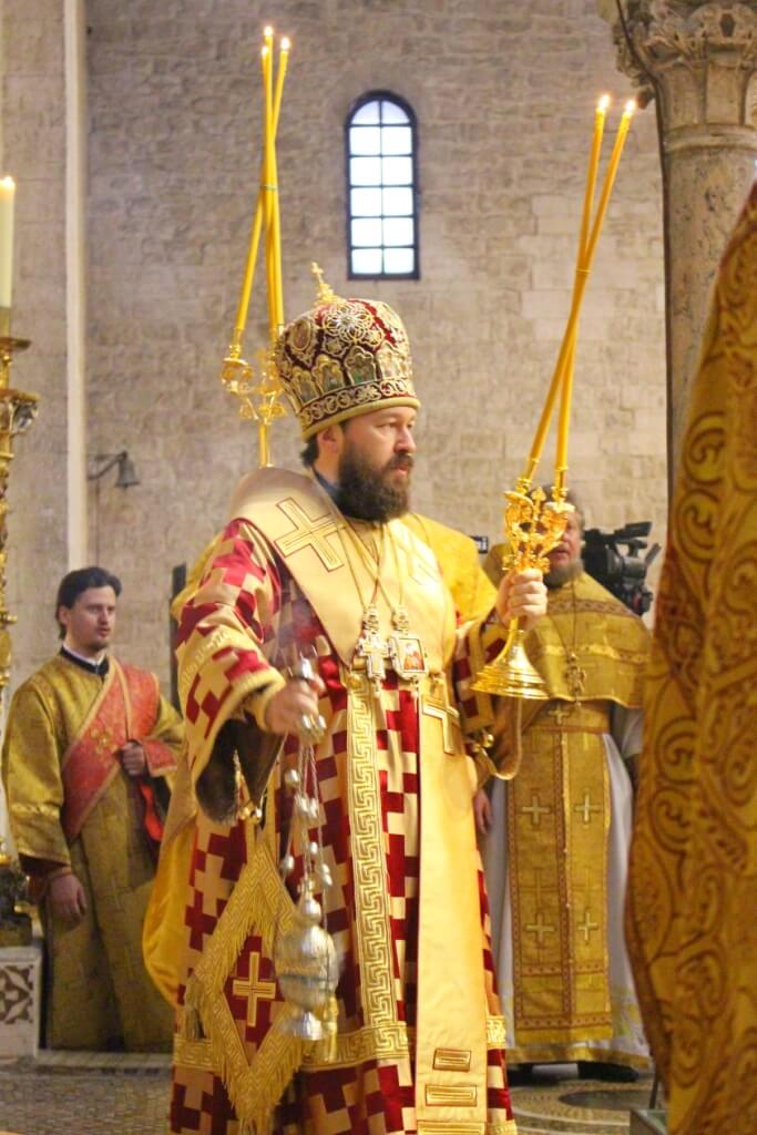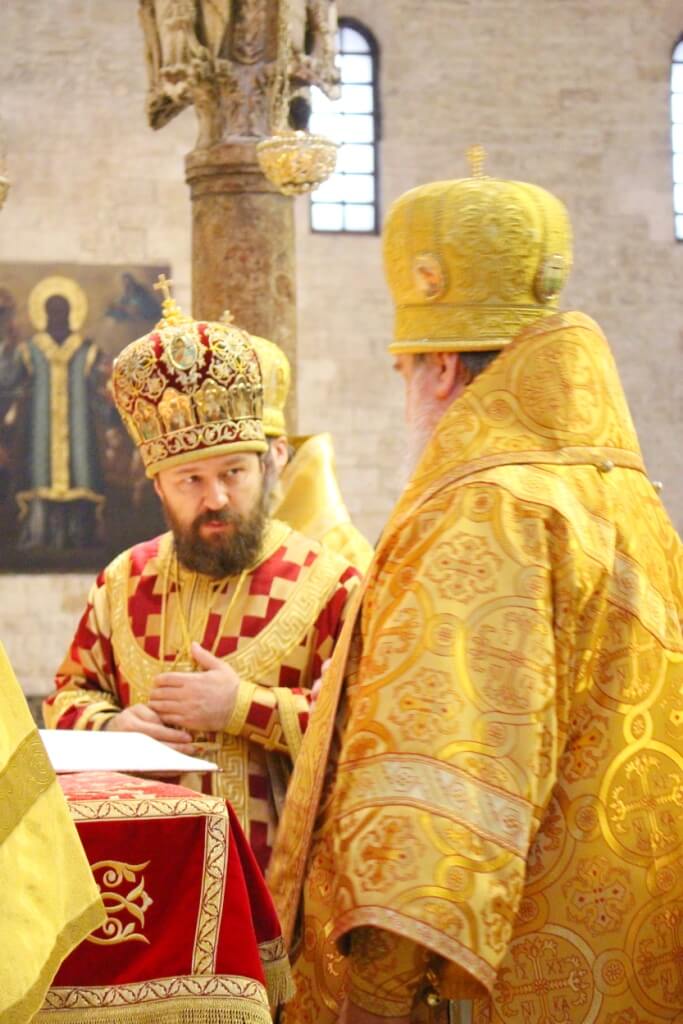 В верхнем храме базилики святителя Николая председатель ОВЦС возглавил Божественную литургию. Архипастырю сослужили митрополит Смоленский и Дорогобужский Исидор, епископ Вяземский и Гагаринский Сергий, председатель Синодального отдела по делам молодежи епископ Истринский Серафим и епископ Рославльский и Десногорский Мелетий, сонм духовенства из России, Украины, Беларуси, Молдовы и других стран, составляющих каноническую территорию Московского Патриархата.