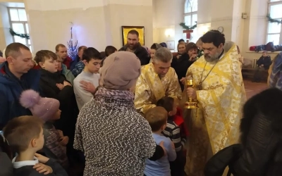 По окончанию Богослужения игумен Александр вручил каждому ребенку календарь и шоколадку, а после концерта все дети отправились в трапезную, где для них было организовано чаепитие со сладостями.