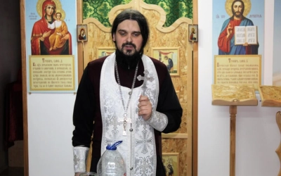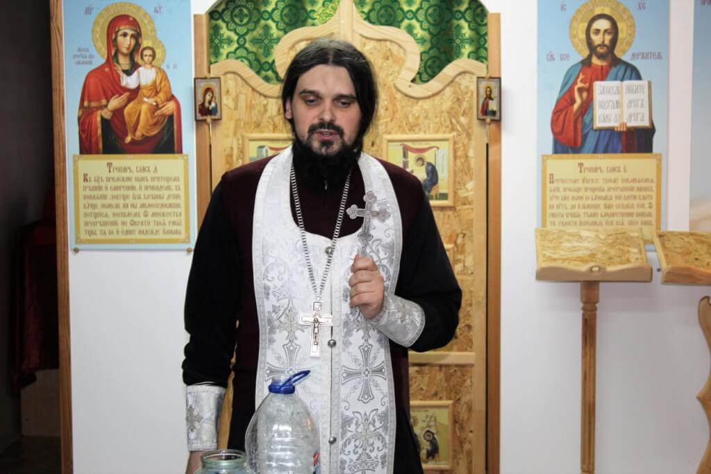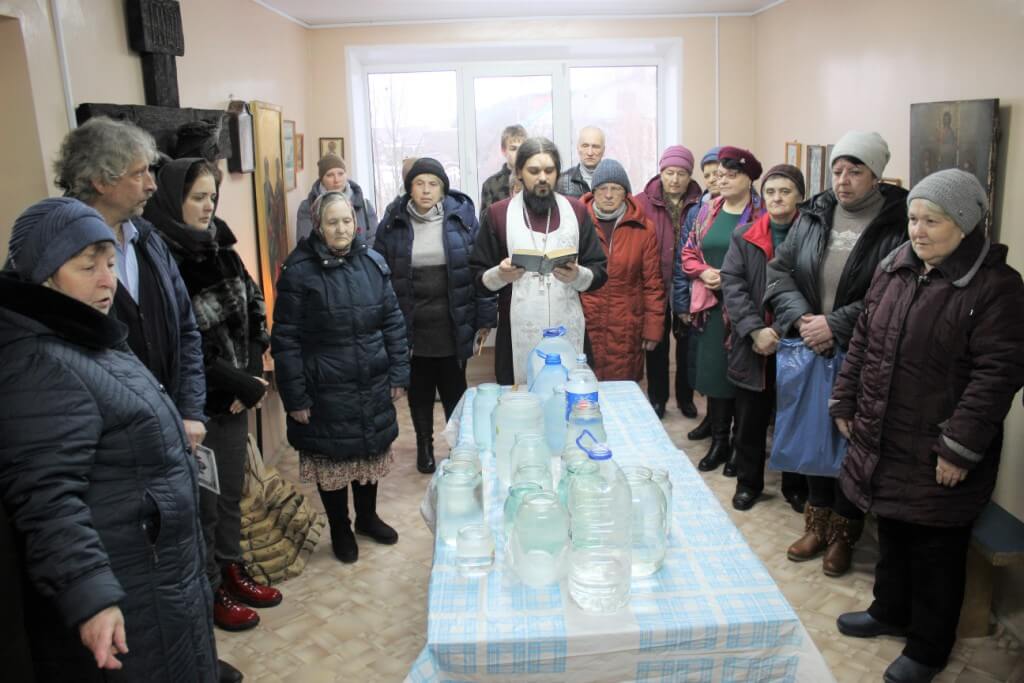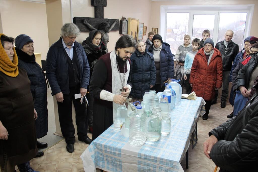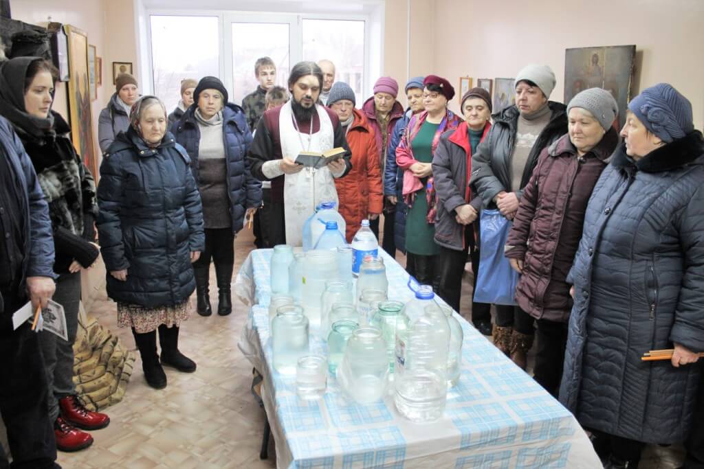 Отец Александр совершил чин освящения воды. Рассказал присутствующим об истории праздника. Напомнил, как правильно хранить и использовать Крещенскую воду.