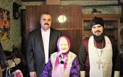 В этот же день отец Александр вместе с представителями местной администрации поздравил с 90-летним юбилеем, одну из старейших жительниц деревни Касня, Векшину Любовь Александровну, которая всю свою жизнь посвятила Касне и Каснянской школе, где на протяжении 49 лет работала учителем русского языка и литературы.