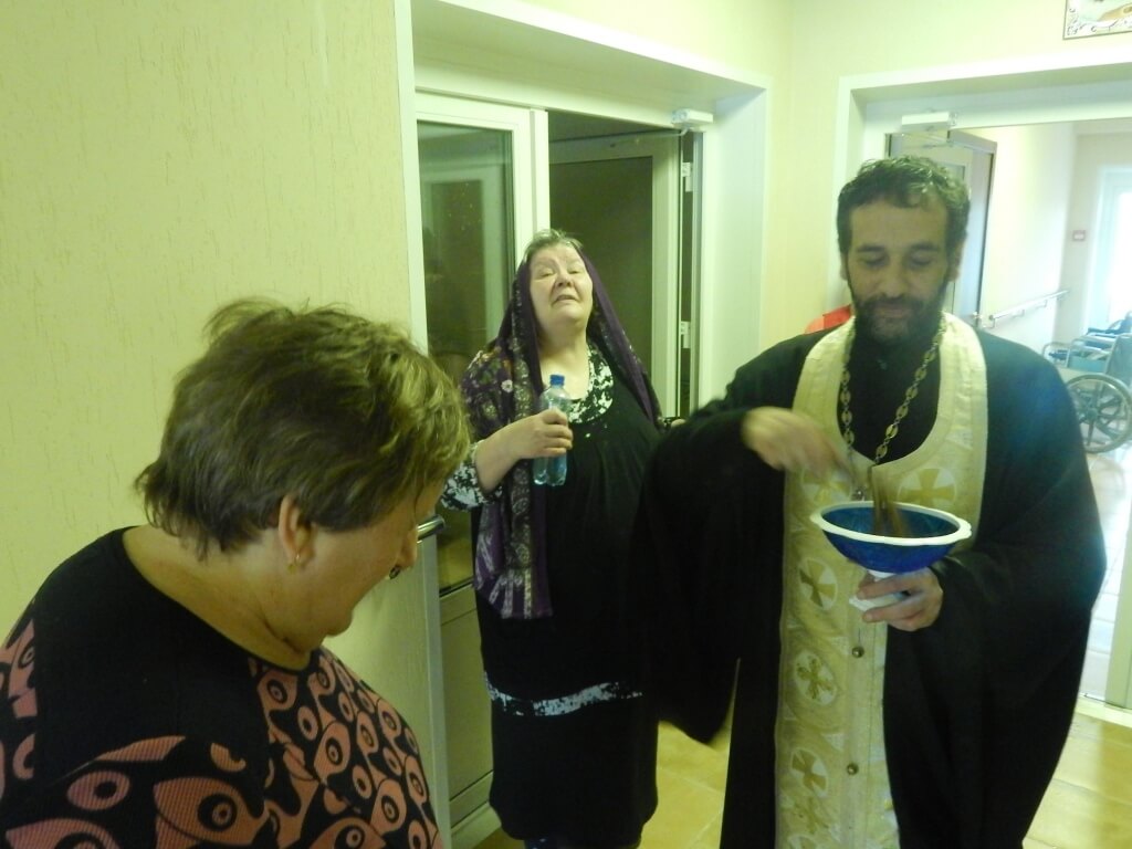 После молебна отец Павел окропил здание Святой водой и пообщался с опекаемыми дома-интерната, ответив на их вопросы.